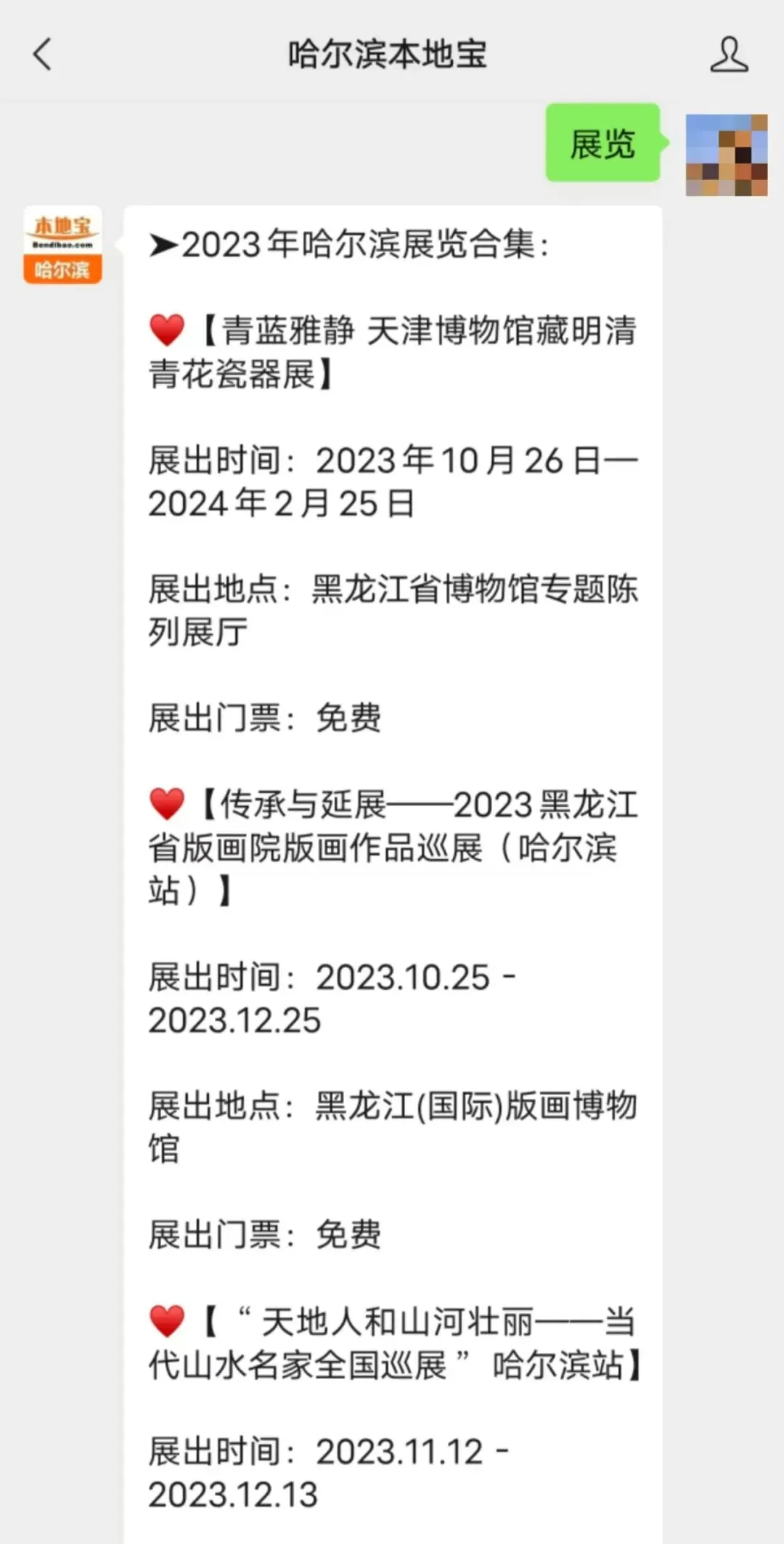 可以点击下方名片,关注【哈尔滨本地宝】,在消息聊天对话框中回复【展览】,可以获取哈尔滨近期展览展出时间及地点等更多内容。