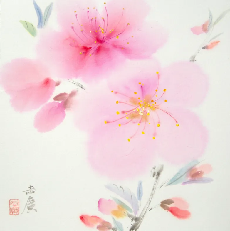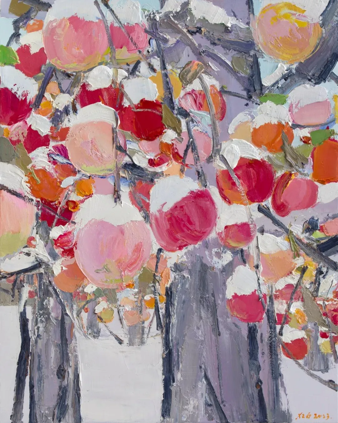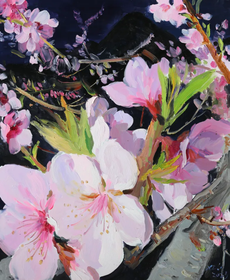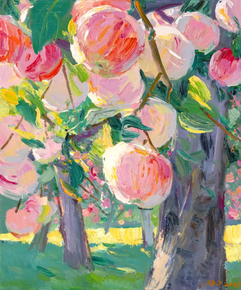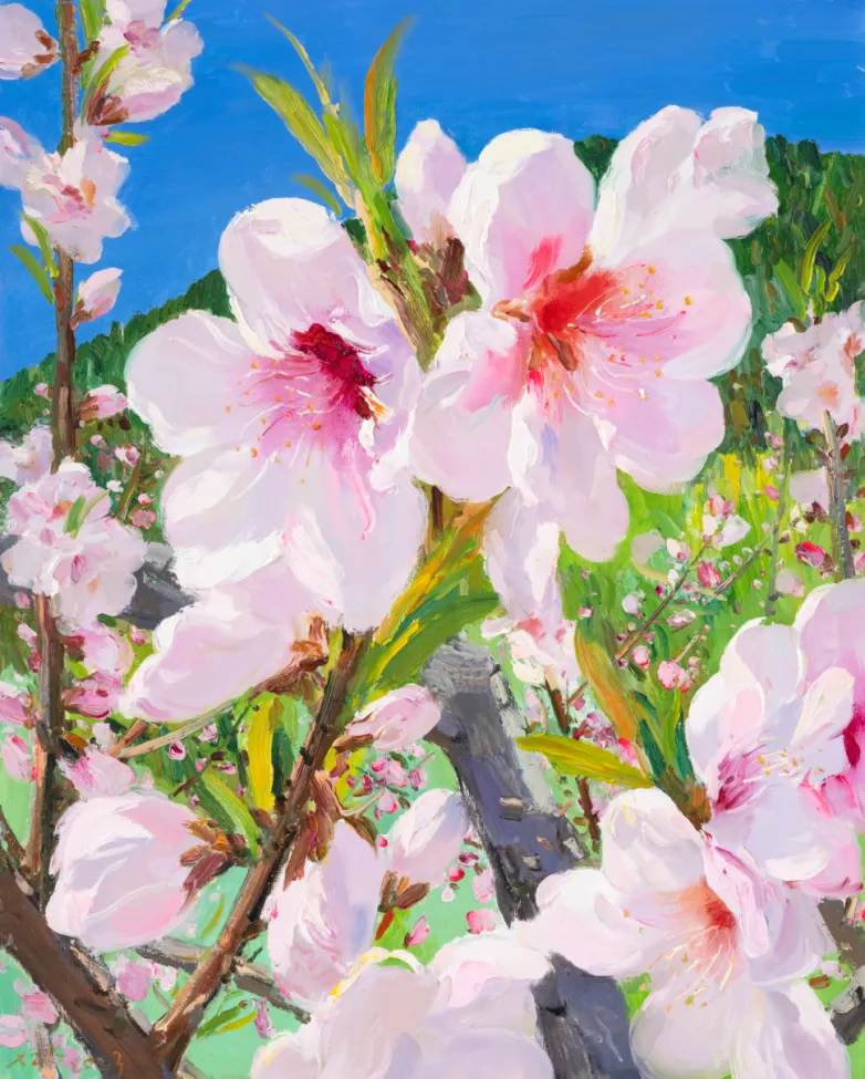 Xu Zhiguang's works primarily feature peach blossoms and apple trees, cleverly revealing both the contrasts and resonances between the two. The peach blossoms symbolize the bloom and beauty of spring, embodying the lightness and warmth of life; while the apple tree symbolizes harvest, resilience, and the steady flow of life. In his paintings, the delicate beauty of the peach blossoms complements the ruggedness of the apple trees, creating a natural scene that is both harmonious and full of strength. Whether depicting the splendor of the peach blossoms in rich, vivid colors or presenting the weightiness of the apple tree with subtle tones, Xu Zhiguang evokes an emotional response that stirs within us a boundless reverence for nature and life.