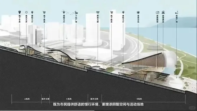 选址具有中轴区位优势、滨海景观优势和配套建设优势,项目的建成将促进中轴线的完善,提升整个片区的活力和吸引力。