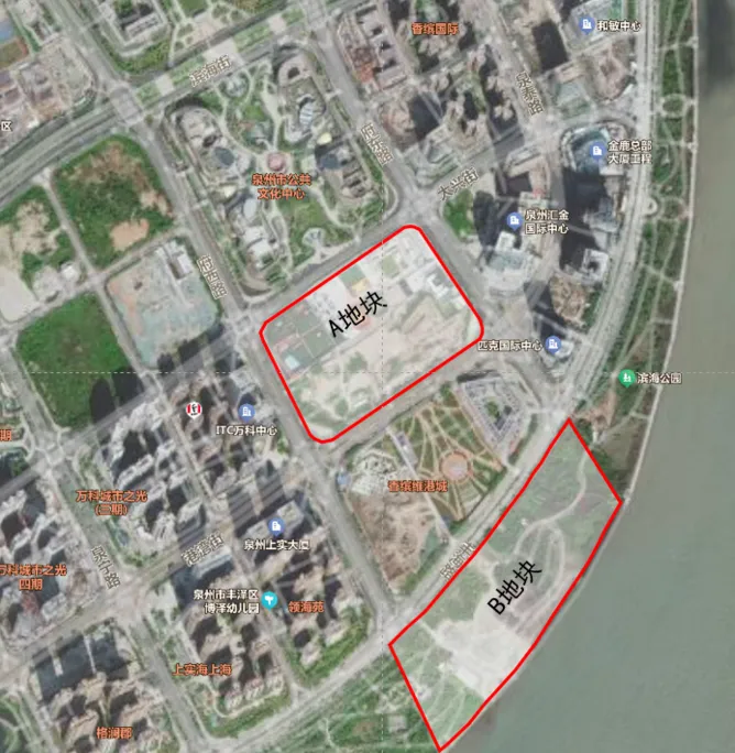 其中,A地块位于四朵花瓣旁,北至大兴街,南至港湾街,西至府西路,东至府东路,南北长约255米,东西长约391米,占地约9.57万平方米;B地块位于滨海公园,北至丰海路,南至泉州湾,西至府西路,东至府东路,南北长约204米,东西长约624米,占地面积约12.39万平方米。