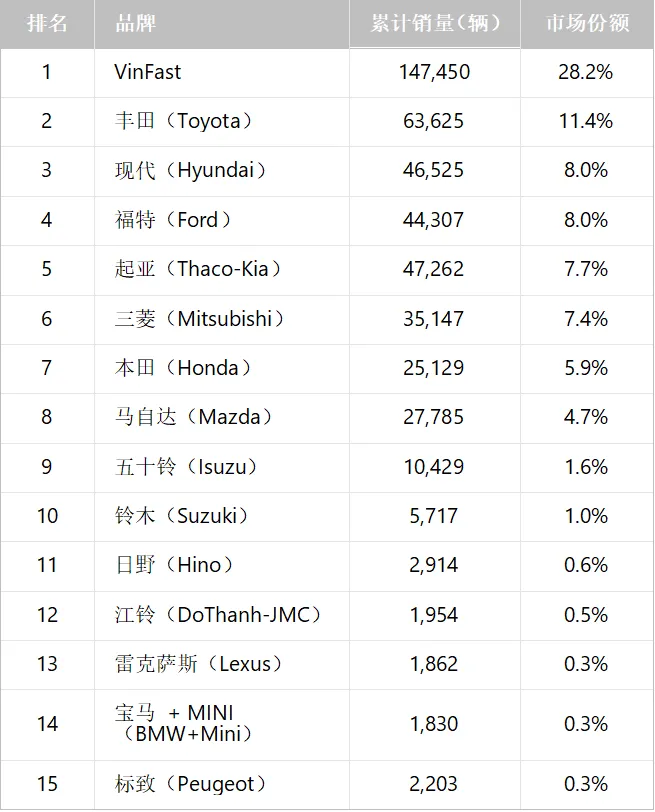 2025越南市场是一个被VinFast彻底改写的市场,本土新能源汽车品牌Vinfast超越丰田,成为排行榜第一。越南汽车市场价格敏感度极高,主销车型集中在 10–20 万人民币区间,小型 SUV、MPV、皮卡非常吃香,轿车的存在感反而在下降。