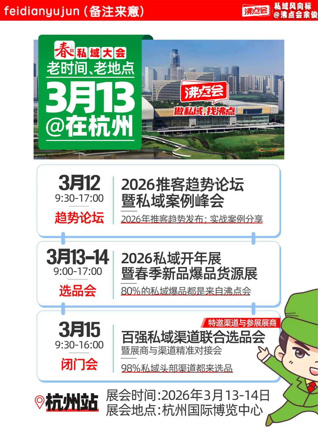 2026私域开年大展,第30届沸点会暨杭州私域大会,3月13-14日在杭州国际博览中心举办。老时间,老地点,带上你的伙伴,让我们携手共赴2026。