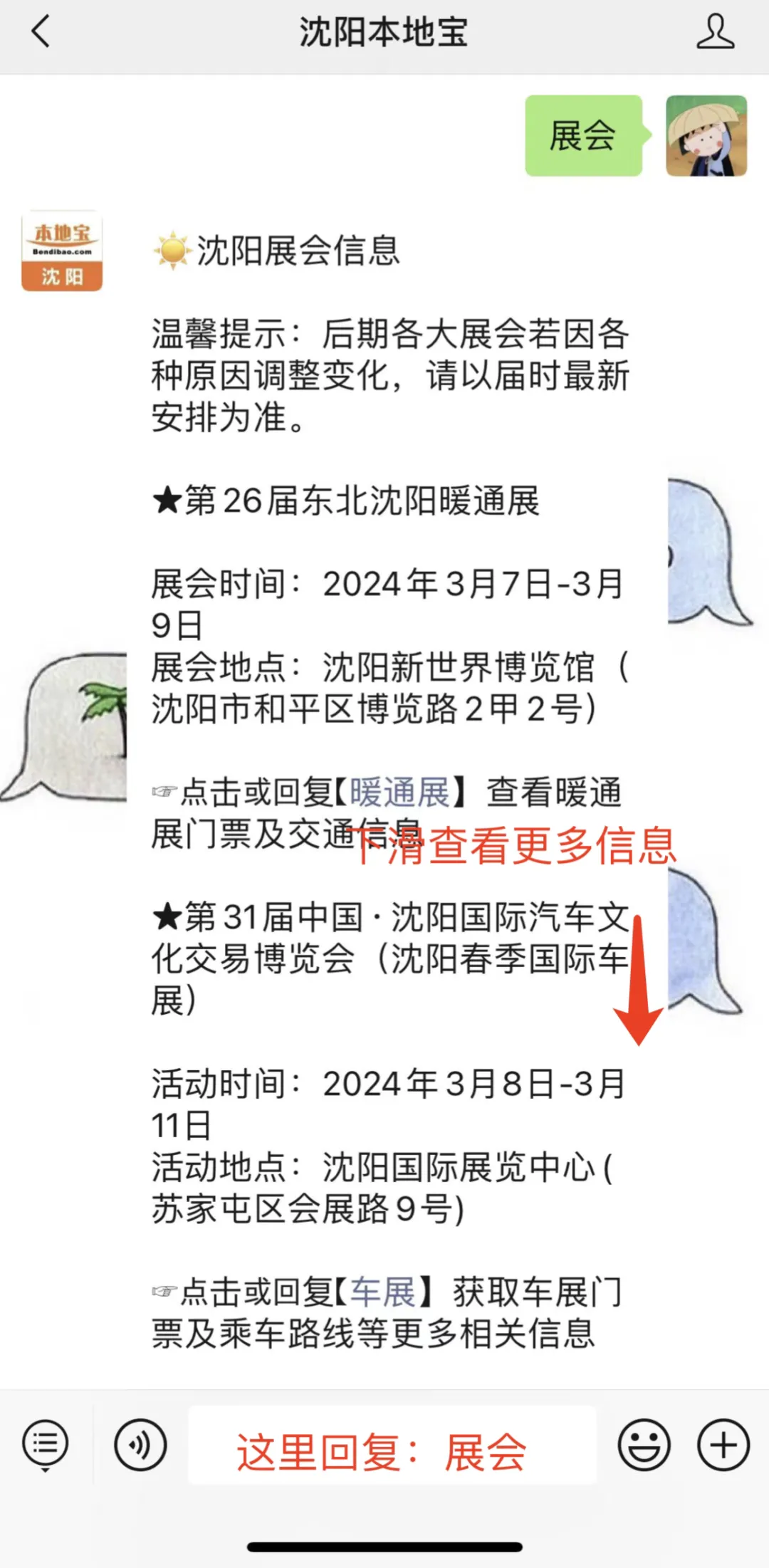 ?小编提醒:打开【沈阳本地宝】,在聊天对话框回复车展,即可获取免费门票获取方法、交通指南及更多车展信息。