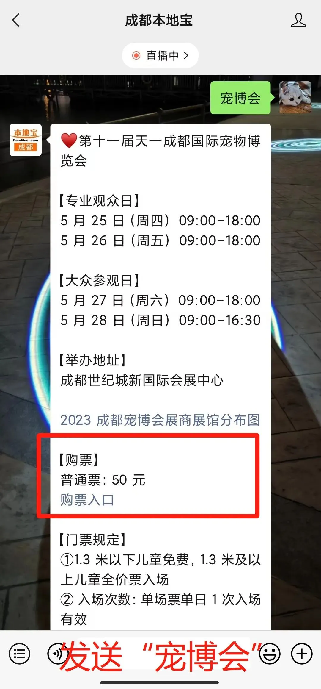 ?购票入口:点击下方链接并关注【成都本地宝】公众号,在对话框发送【宠博会】直接进入购票入口,获取展期活动、入场指南等。