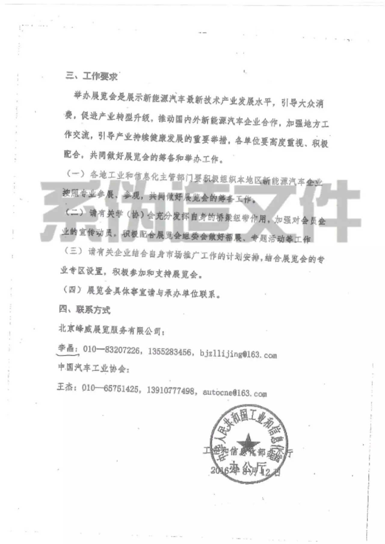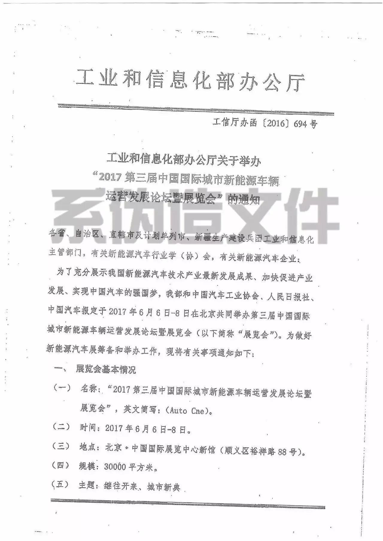近日,有单位接到所谓《工业和信息化部办公厅关于举办“2017第三届中国国际城市新能源车辆运营发展论坛暨展览会”的通知》(工信厅办函〔2016〕694号)的文件,并称“我部和中国汽车工业协会、人民日报社、中国汽车报定于2017年6月6日-8日在北京举办第三届中国国际城市新能源车辆运营发展论坛暨展览会”。