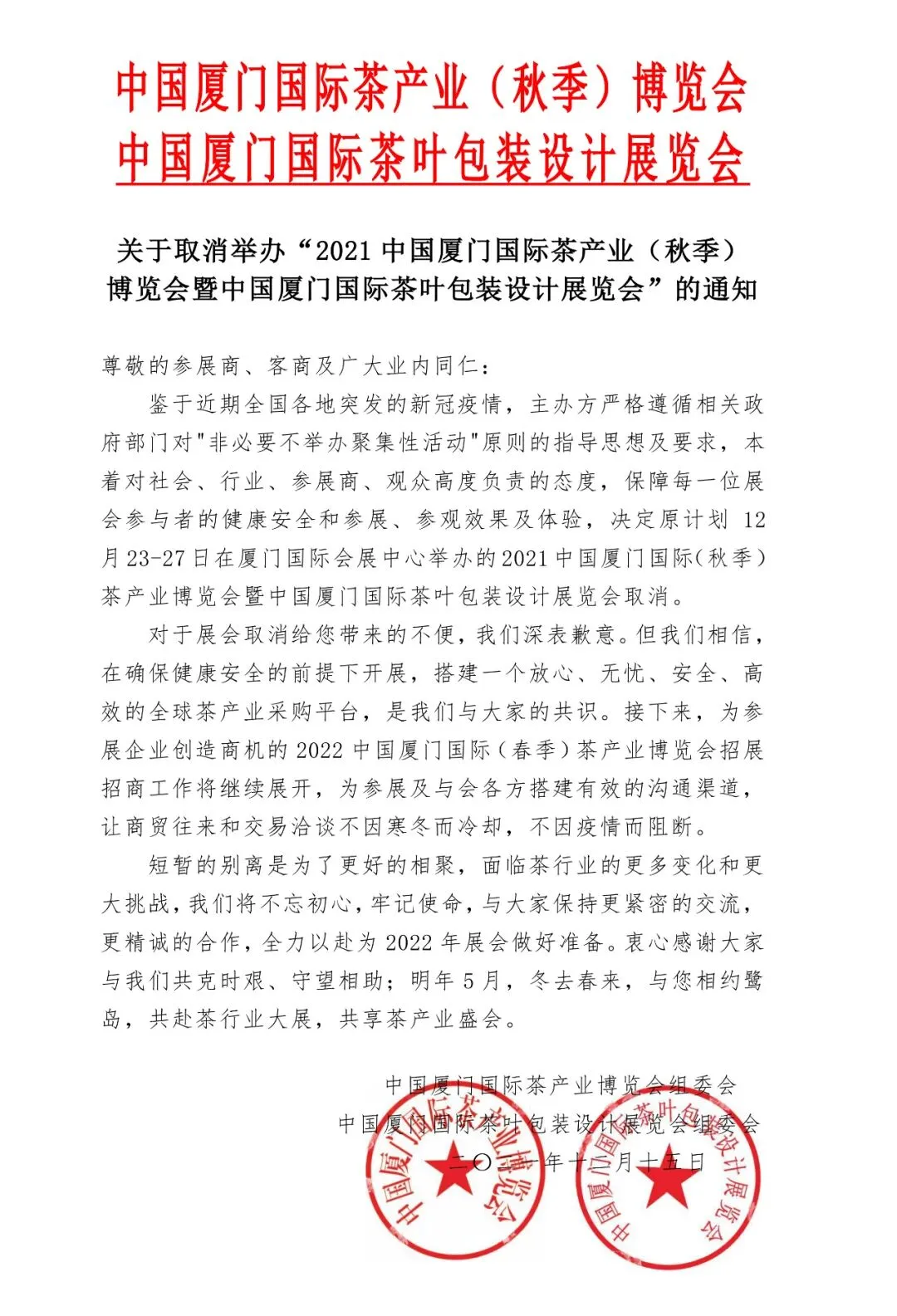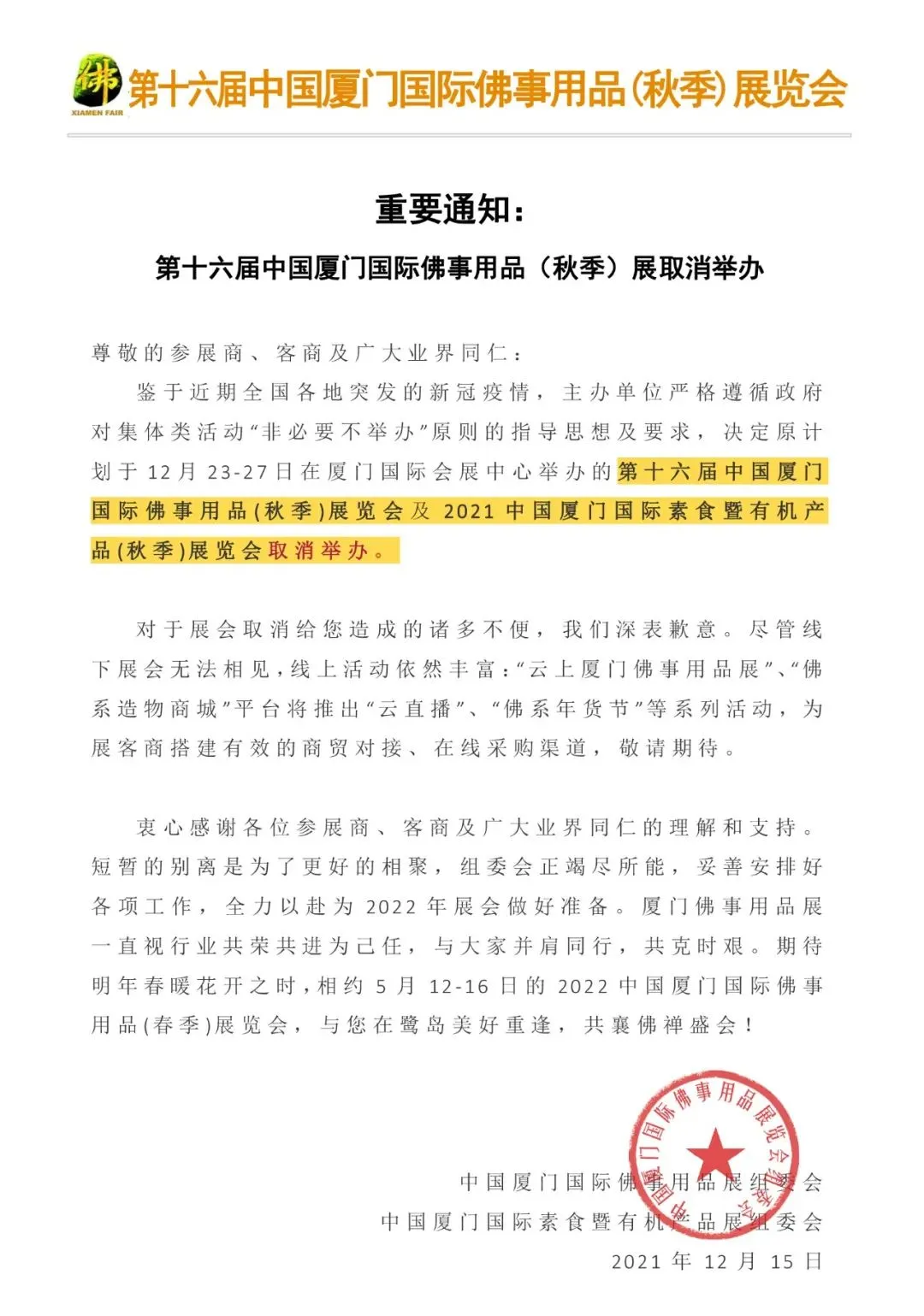 据悉,本届展会原计划于12月23日-12月27日在厦门国际会展中心举办,鉴于近期全国多地突发的新冠疫情,主办单位严格遵循我市对集体类活动“非必要不举办”原则的指导思想及要求,决定取消。