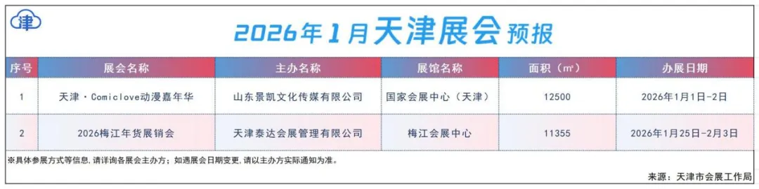 2026年1月份,国家会展中心(天津)、梅江会展中心将举办展会活动2场。主要展会活动内容预报如下: