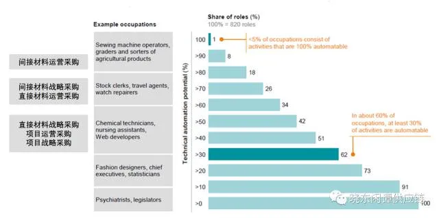 在未来10-15年,不同的采购品类和不同的采购工作内容的采购职位也会呈现如上图所示麦肯锡对于美国市场会被人工智能替代的工作分析的类似分布。