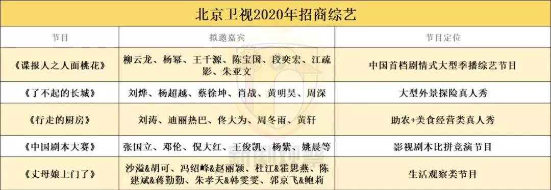值得期待的是,在前几日的招商会现场,北京卫视节目中心的领导公布了北京卫视明年的新综艺布局,其中包括五部全新类型的综艺节目。