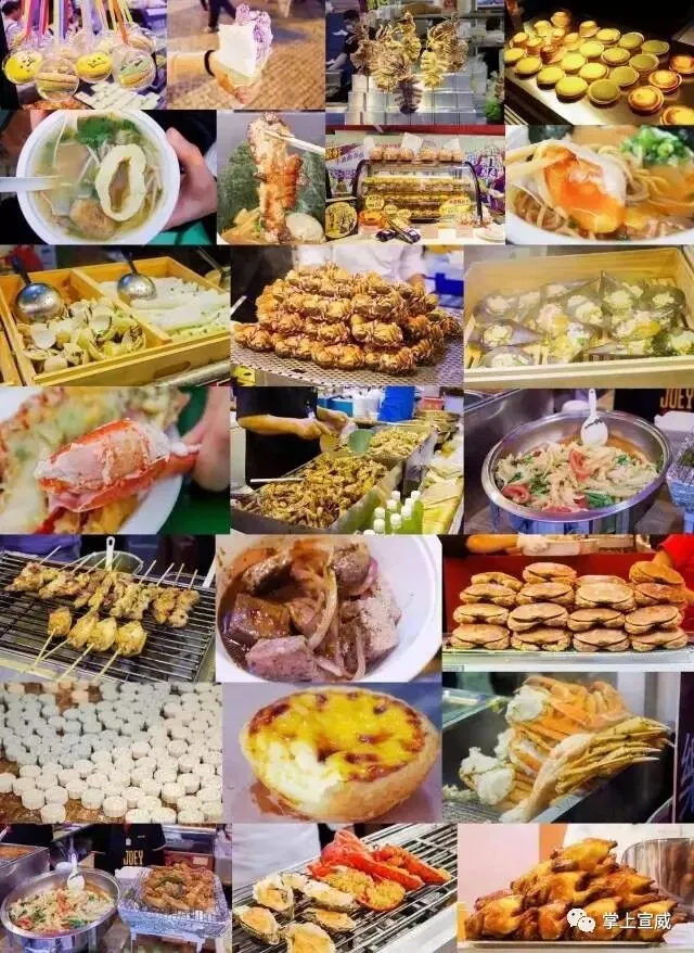 印度飞饼、陕西肉夹馍、台湾鲜榨果汁、台湾香酥一口蟹、可乐炸鸡杯、蒙古烤肉、天津狗不理、老北京雪梨汤、长沙臭豆腐、重庆麻辣田螺、老北京雪梨汤、台湾旋风薯塔、嘟嘟包、虾兵蟹将、大连火爆鱿鱼、还有“12道锋味”的鸡蛋仔冰激凌......