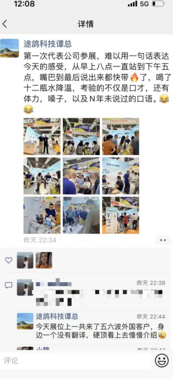 有CCEE展商朋友圈晒图:“第一次代表公司参展,难以用一句话表达今天的感受,从早上八点一直站到下午五点,嘴巴到最后说出来都快带火了,喝了十二瓶水降温,考验的不仅是口才,还有体力,嗓子,以及N年未说过的口语。”