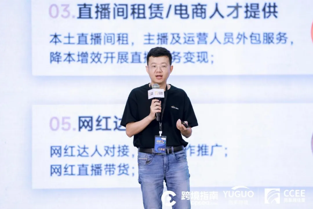 雨果跨境副总裁兼跨境分销部负责人游锐介绍雨果跨境(印尼)电商服务中心的六大服务功能——企业注册\本土店开通、物流仓储服务、直播间租赁\电商人才提供、本土店代运营、网红达人推广、特殊经营资质办理。