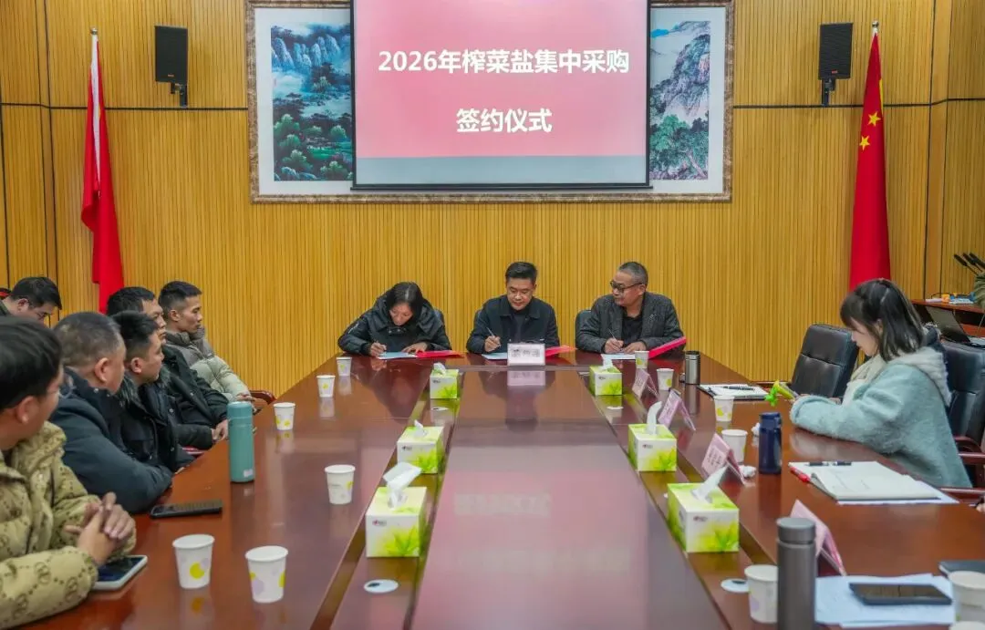 12月23日,2026年涪陵榨菜用盐集中采购会在涪陵区百胜镇召开。此次采购会旨在搭建规范高效的供需对接平台,深化企业合作机制,优化采购流程管理,推动榨菜产业实现降本增效,进一步巩固和擦亮“榨菜原乡”的金字招牌。会上,涪陵产业集团相关负责人系统解读了农资集中采购的相关政策与流程。中盐西南渝东南公司相关负责人则聚焦榨菜加工专用盐,详细讲解了产品规格、品质特点、适用场景及采购注意事项,为榨菜企业用盐提供了专业指导。会议现场还举行了集中签约仪式,供需双方根据实际采购计划,签订了正式订单,明确了合作细节与履约要求,确保后续供应的稳定性与可靠性。据统计,本次采购会共达成8500吨榨菜用盐采购意向订单。“本次集中采购会通过统一组织、规范交易,不仅有助于榨菜生产企业稳定原料质量、控制生产成本,也为盐品供应商提供了精准对接下游市场的渠道,是涪陵区推动榨菜产业供应链协同创新、助力产业高质量发展的重要举措。”区产业集团相关负责人介绍,接下来,将继续依托此类平台,持续优化产业服务,强化产业链上下游协作,护航榨菜这一特色产业行稳致远。