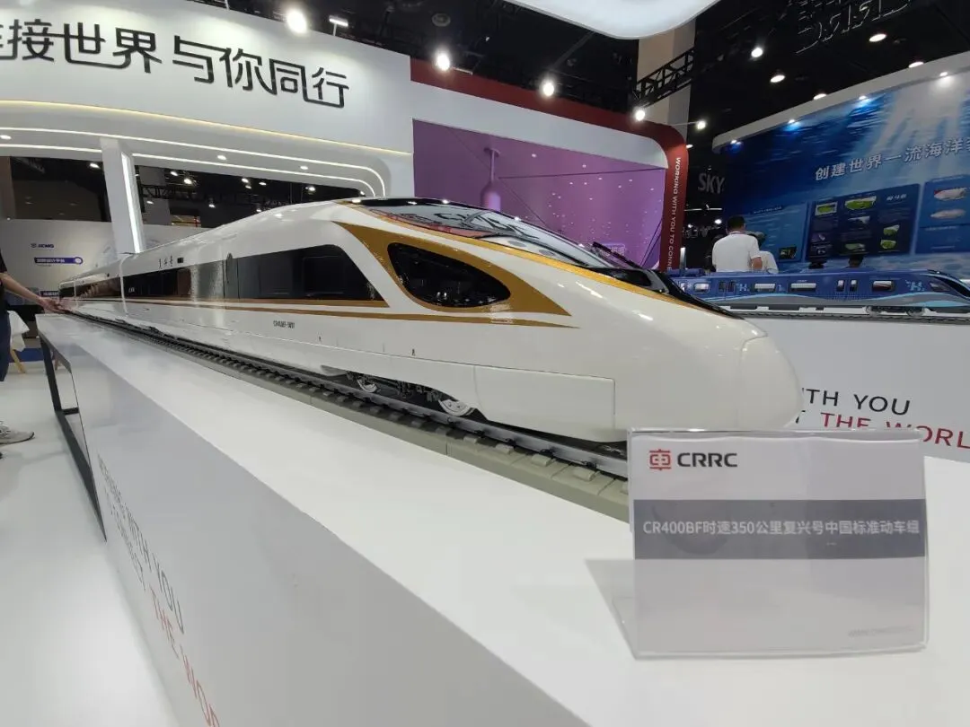 中车长春轨道客车股份有限公司的展厅里,时速160公里的氢能源全自动智慧市域列车、时速350公里的复兴号中国标准动车组等四列超长的簇新动车模型错位排列在正中央,标准优美的流线型车身、简约大气的配色与图案将大国重器的高级感展现得淋漓尽致。