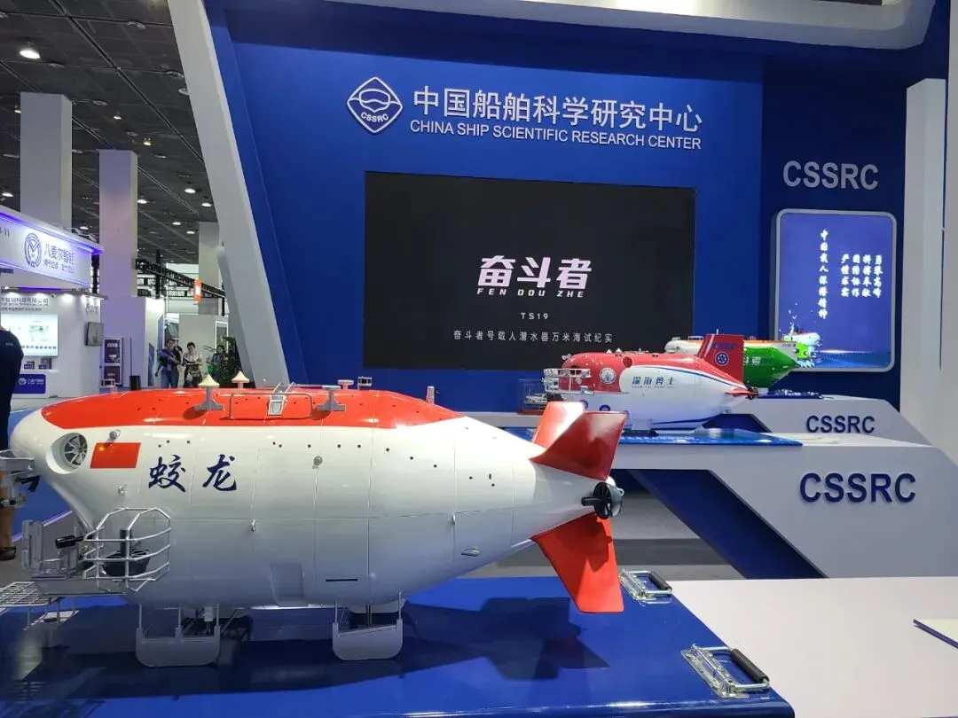 中车展厅的隔壁,就是中国船舶科学研究中心展厅,“蛟龙”号、“深海勇士”号、“奋斗者”号三座载人深潜器模型以及各种船模陈列在展厅内,讲述着中国在蔚蓝大海的探险故事。