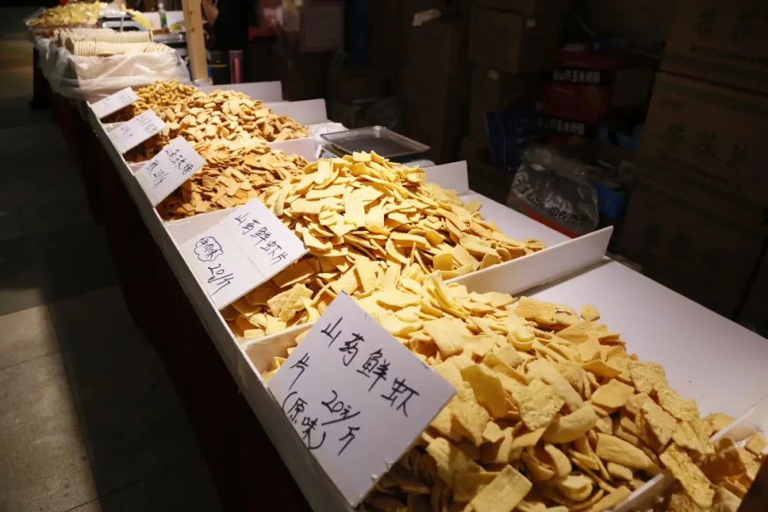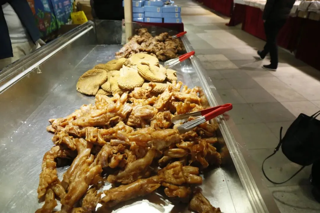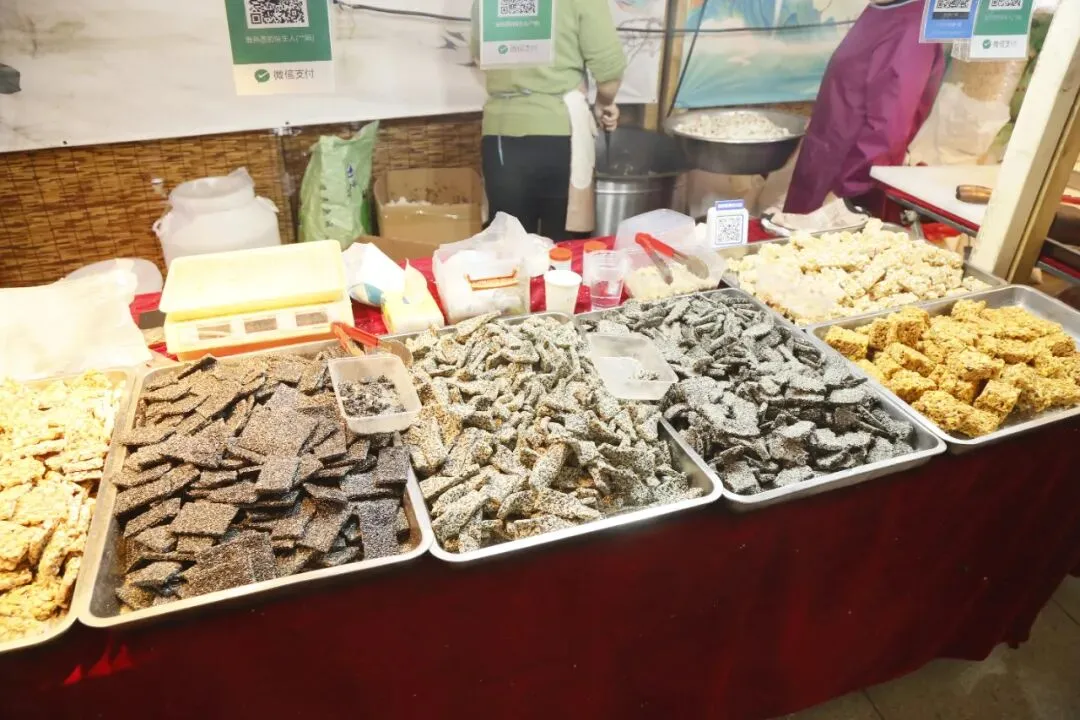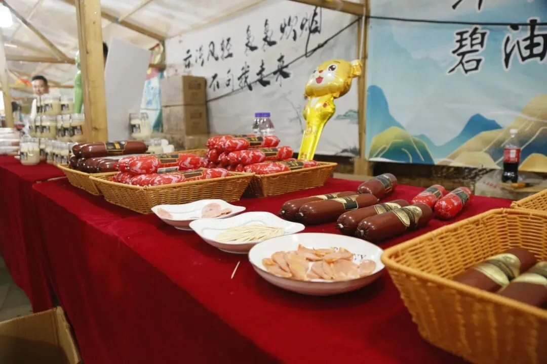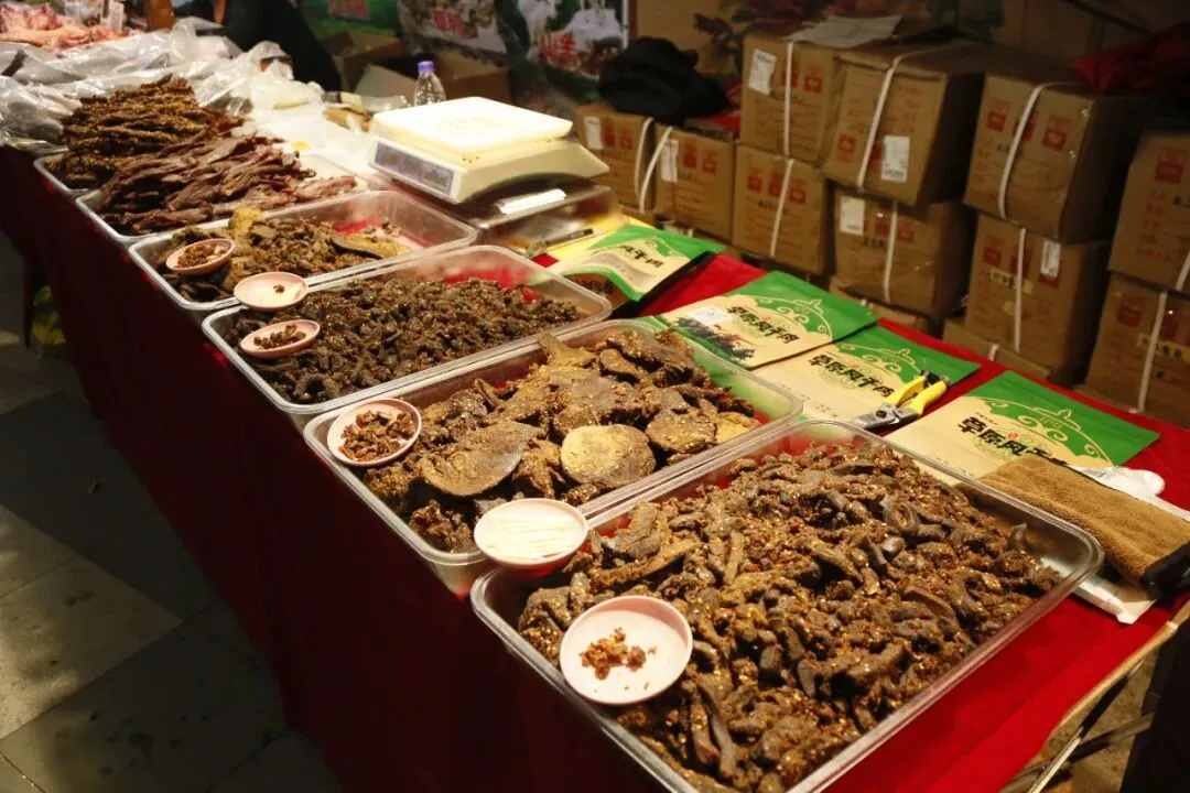 展销会现场众多食品试吃先试吃后购买,不好吃不用买。有:炭烤红肠、牛肉干、炒米糕、梨膏糖、野山梨等等。