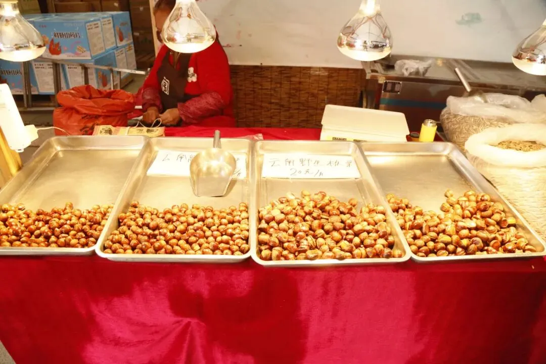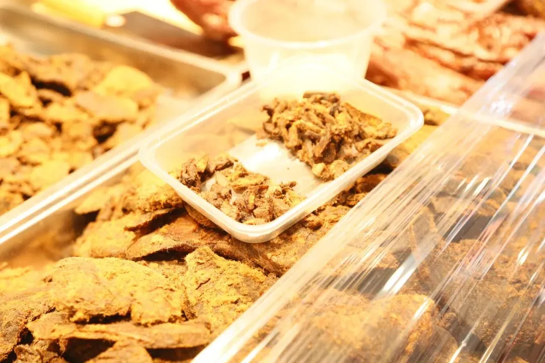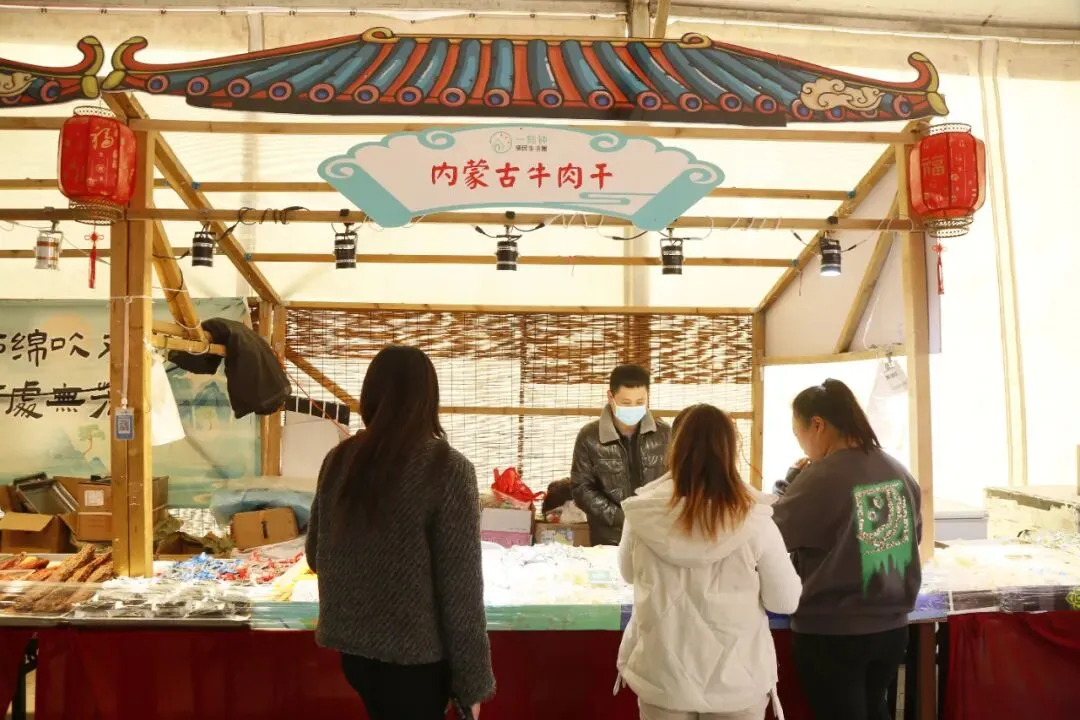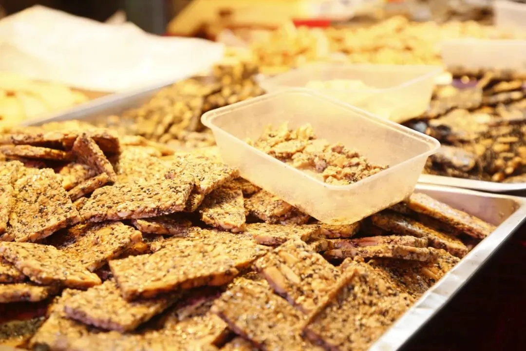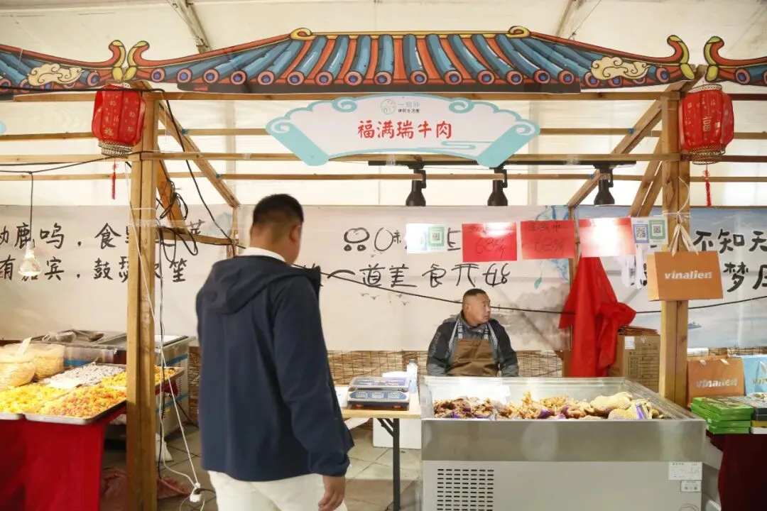 展销会现场众多食品试吃先试吃后购买,不好吃不用买。有:炭烤红肠、牛肉干、炒米糕、梨膏糖、野山梨等等。