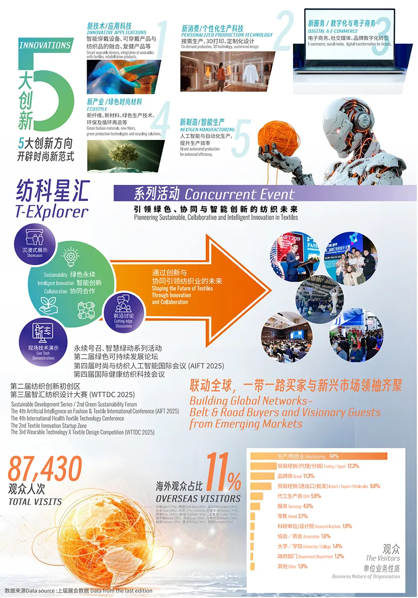 本届将以“同行永续.织动未来”为展会主题,围绕五大创新方向,与纺织企业、专家学者、设计师和品牌创新者携手,一同规划行业的新版图,缔造纺织品的工艺、设计和创新的更多可能性。
