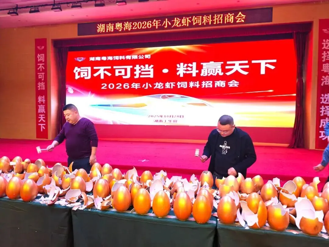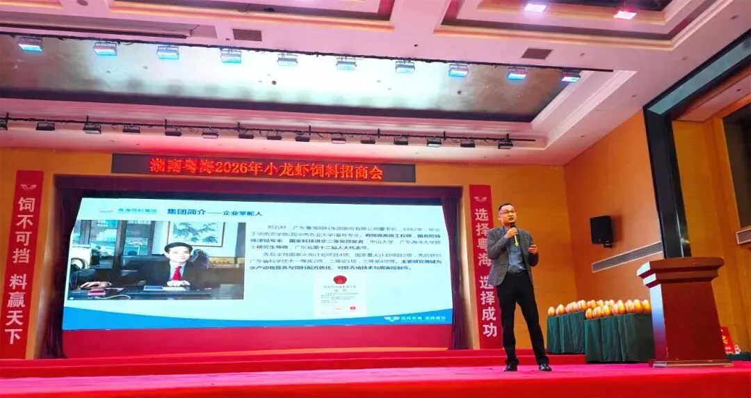 为进一步破解湖南地区小龙虾养殖亩产不高、效益不稳的行业痛点,赋能区域小龙虾产业升级,2025年10月28日,湖南粤海在华容县华冠君豪大酒店举办以“饲不可挡・料赢天下”为主题的2026年小龙虾饲料招商会,以饲料、动保、技术三方联动,分享前沿养殖方案,携手养殖户共赢2026。招商会现场,湖南、湖北两地160余位经销商代表参会,订料量突破9550吨。