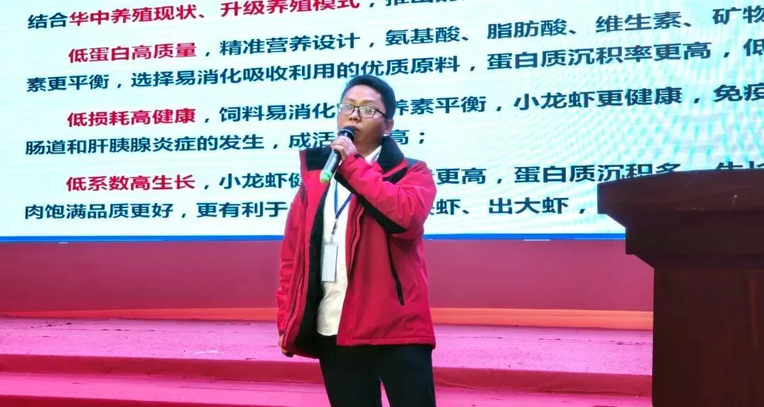 活动现场,湖南粤海配方师李昭林围绕湖南小龙虾养殖实际需求,开展技术培训与产品介绍,针对性破解当地“长不大、赶不上、卖不贵” 的发展困境。他重点介绍了粤海饲料集团推出的“粤海甄虾粮”,甄虾粮基于集团“三高三低”先进技术理念,即 “低蛋白高质量、低损耗高健康、低系数高生长”,精准匹配小龙虾的营养需求。产品选用高消化率原料,包括进口鱼粉和多种动植物蛋白,保障营养均衡与高效吸收,有效提升小龙虾的生长速度与免疫力。