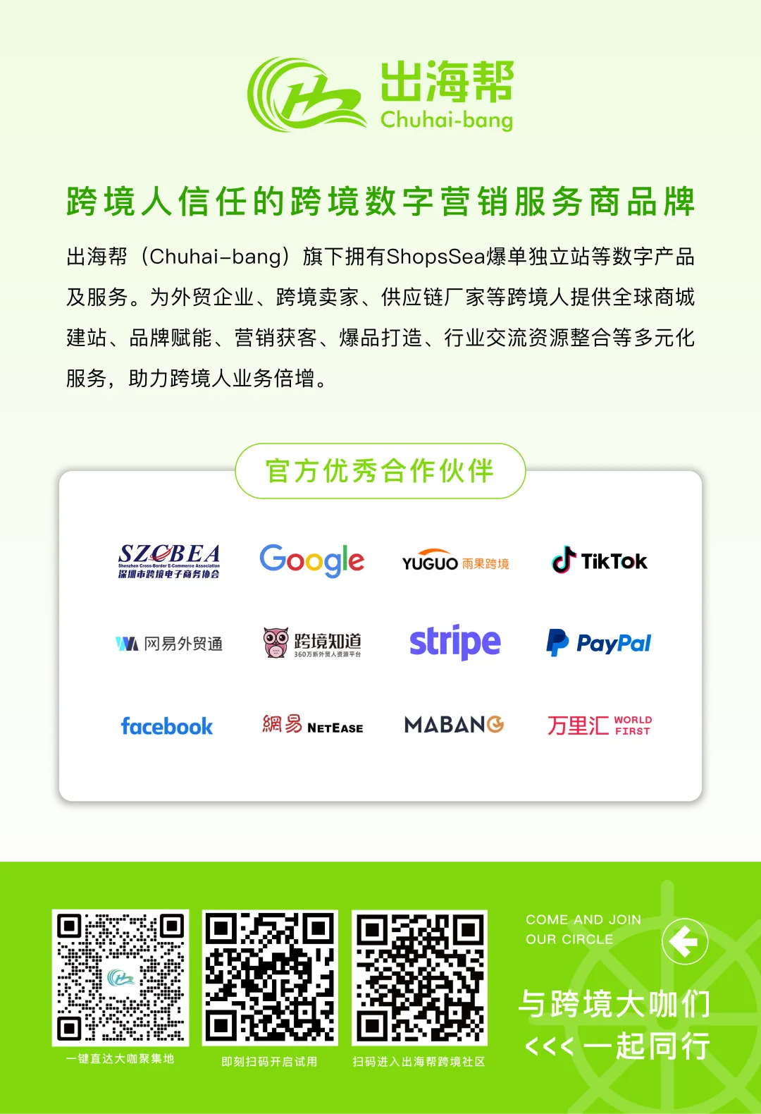 作为深耕跨境行业十余年的科技服务商,出海帮深入全球人文,辐射100w+用户,致力于向广大跨境商户提供能够解决核心痛点,为中国跨境电商全球化的长期战略做出贡献。