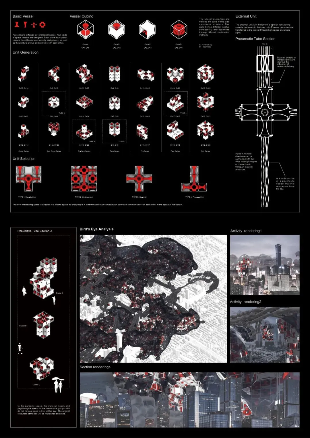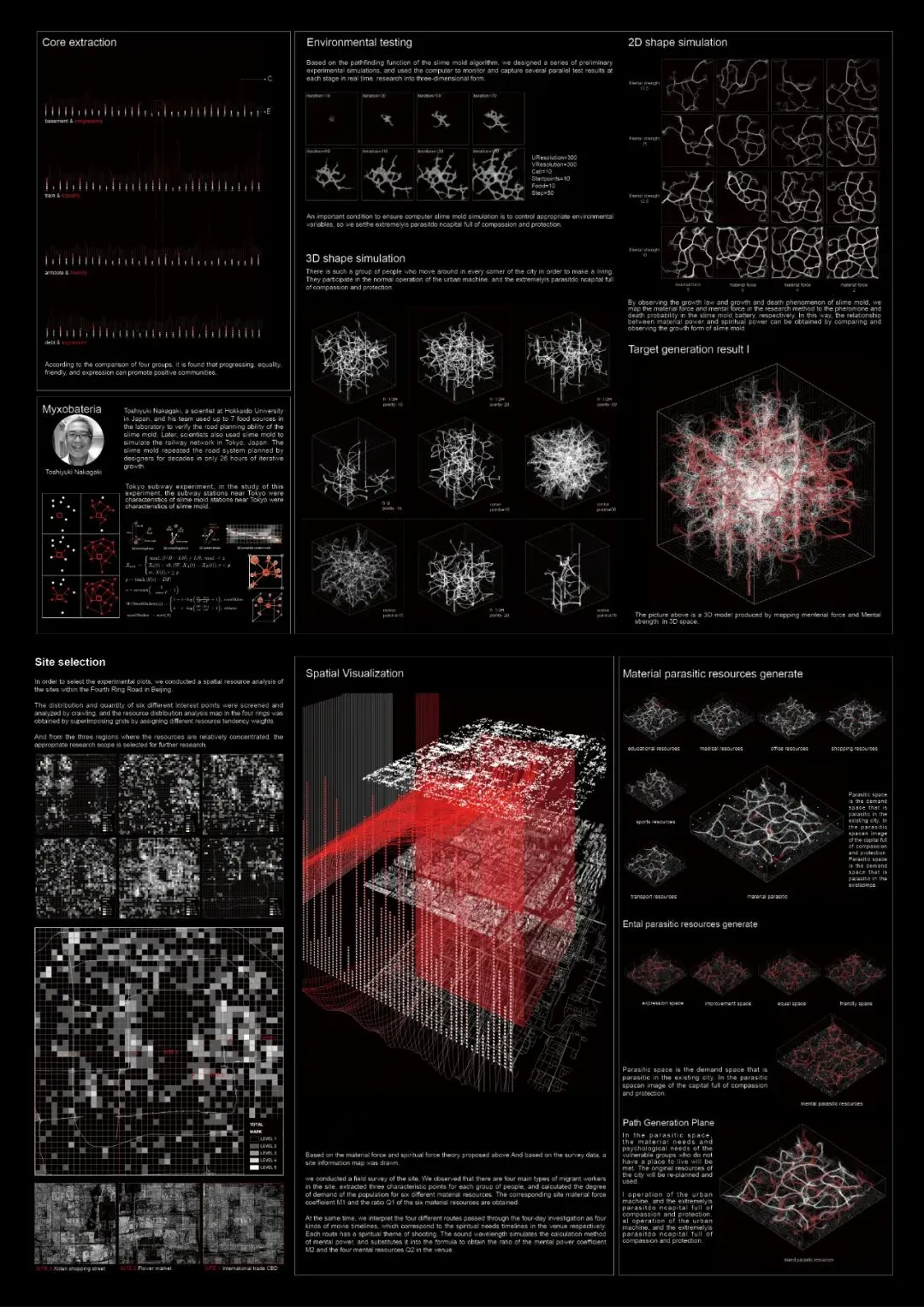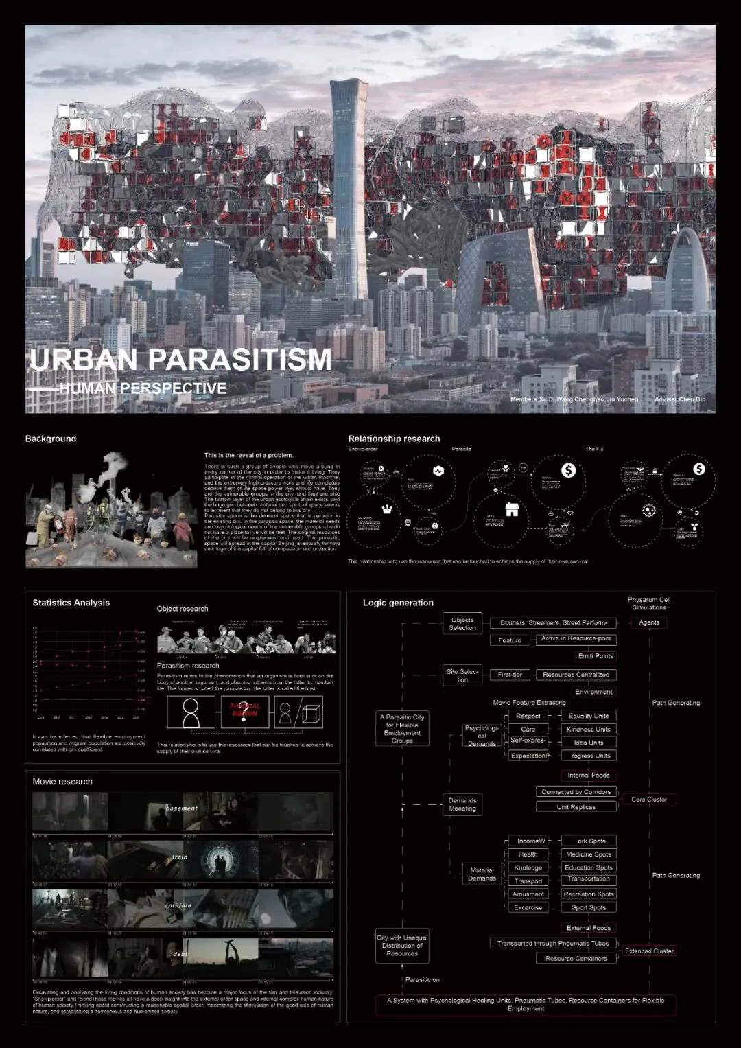 有这样一群人,为了谋生,他们在城市的每个角落里流动。他们参与了城市机器的正常运转,高压的工作和生活完全剥夺了他们本该拥有的空间权力。他们是城市中的弱势群体,也是城市生态链存在的底层,物质空间与精神空间的巨大鸿沟似乎在告诉他们,他们不属于这座城市。我们试图寻找一种方式使这样的弱势群体能够更好的与繁华的城市相融合。在探寻中我们发现这些弱势群体与城市的关系,就好像是生物之间的寄生关系,于是我们深入研究了寄生与城市空间关系,从而发现了寄生空间。