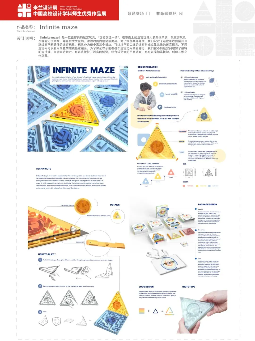 这是一款益智类的迷宫玩具,“玩能创造一切”。市面上的迷宫玩具大多路线单调,玩家游玩几次就能记住路线,趣味性大大减弱,很短时间内就会被抛弃。为了增加其趣味性,我们设计了这款可以拼接并且路线能不断延伸的迷宫玩具。玩具分为低中高三个板块,可以将平面二维的迷宫拼成立体三维的迷宫玩具,不同迷宫间可以利用内置的磁铁任意组合。为了保证珠子能在各个迷宫之间顺利穿行,我们在不同迷宫间增加了独特的连接键。当玩家游玩时,可以直接拉开迷宫的侧壁,组合成更大的平面迷宫,也可以添加连接键,创建三维立体迷宫。(PS:本文封面源于《万物共生》,作者:王嘉傲。)更多赛事信息可关注微信公众号:米兰设计周高校设计展