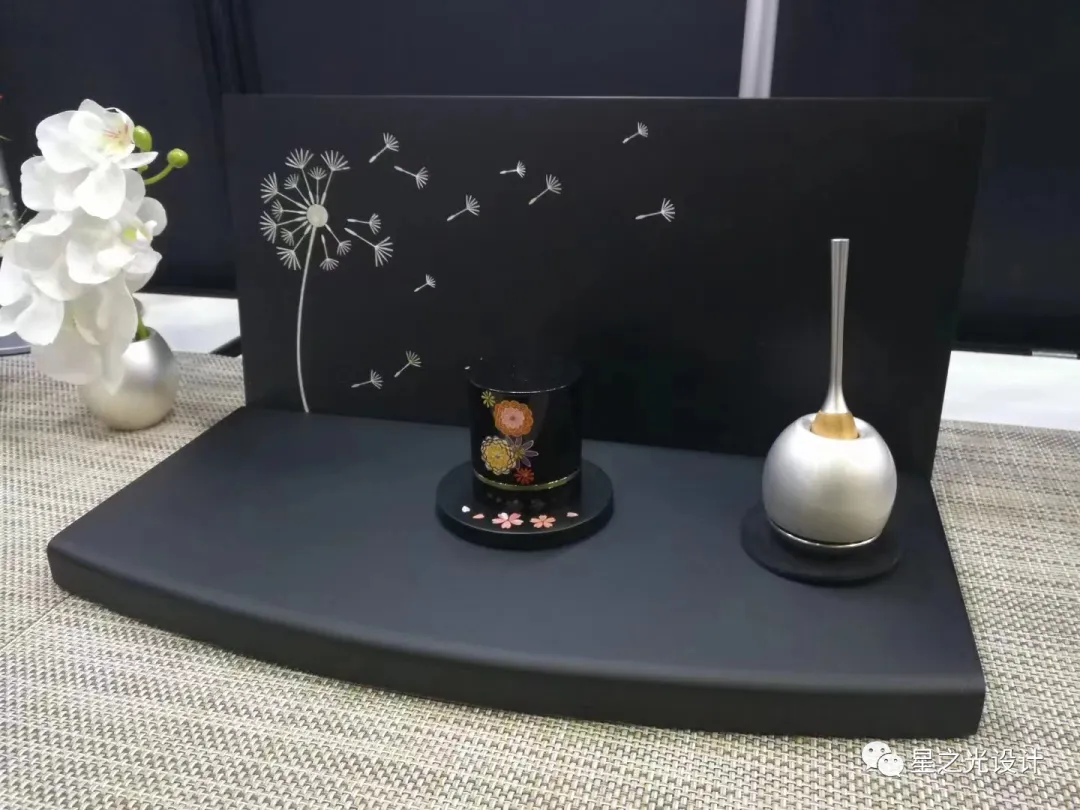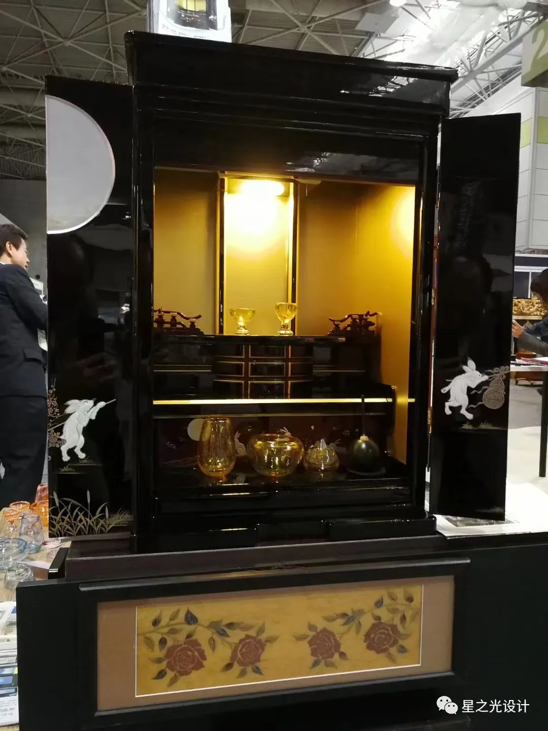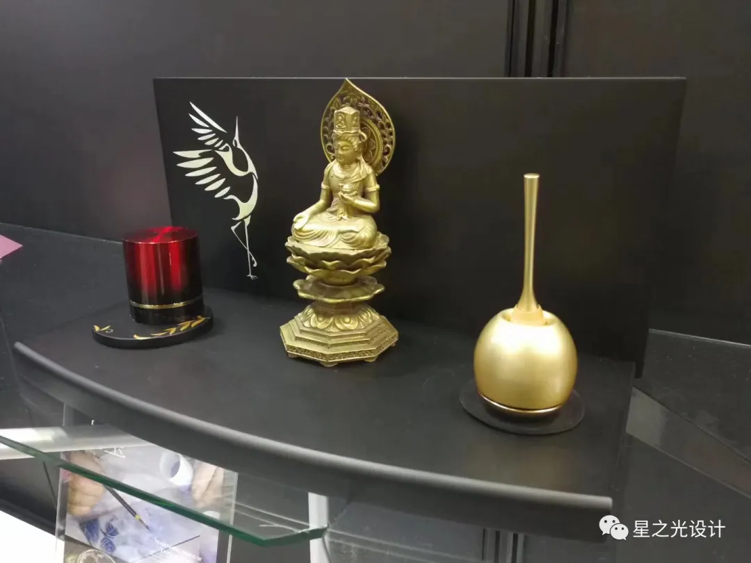 日本的殡葬展会上当然也展出棺木(火化用)、寿衣(日本叫佛衣)、墓碑等殡葬必用产品,但更吸引我的还是那些在中国过去曾经有过、现在却很少看到的祭坛和佛龛,以及在中国还没有、甚至在日本也还并没有普及的“手元供养”等小商品。“手元”是身边的意思,“供养”在中文中也有,但近百年不用了,准确的意思是祭祀。这种祭祀方法是除了将大部分骨灰(日本的火化率99.9%)埋葬在墓地或者存在骨灰堂或者洒在大海之外,留那么一点点装在这些精美的小型容器中,放在家里(“手元”即身边)随时可以祭祀。