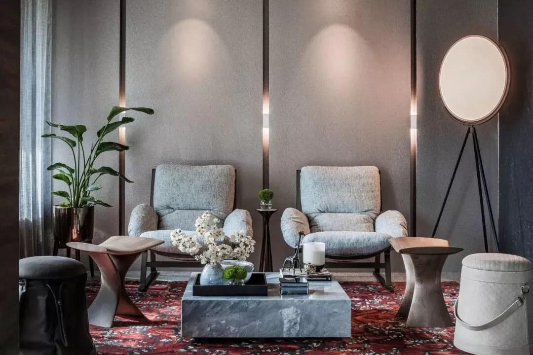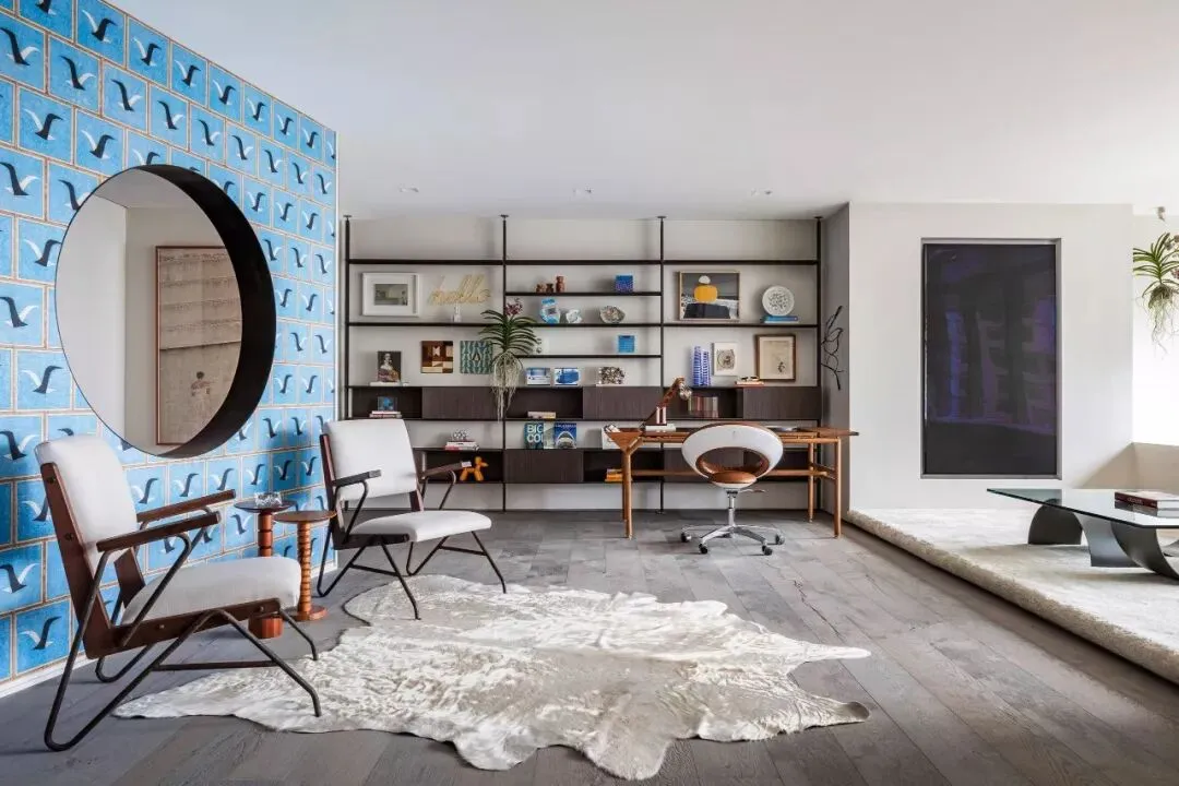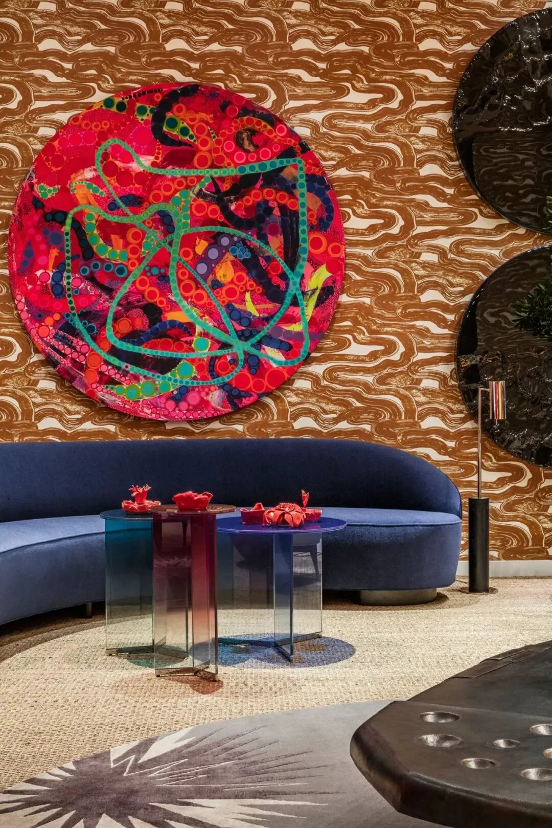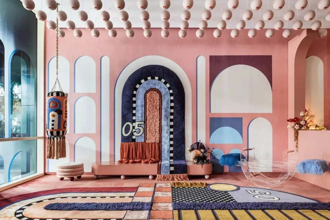 通过未来感的灯光设计,这个空间被想象成一个装有珍贵家具的珠宝盒,设计师首次展示了全套KOA桌子系列。urbina 创造了动态灵活的环境,特别是对于在家工作的人来说,这里简直舒服极了。这个景观设计作品 是建筑工作室 PININFARINA 联合景观事务所 LAND DESIGN 共同创作的。以沉浸式体验,使观看者可以融入内部空间中。米歇尔·海姆 Michelle Haim 是室内设计公司Fanny Haim & Associates的首席执行官兼创意总监。她以柔和的设计手法,将正方形和矩形、圆这类精妙的几何图形揉进空间里。由 Seneca 公司生产的赤土砖几乎覆盖了整个房间,沙色的材质看上去既古老又充满未来感。Moniomi是罗纳德·阿尔瓦雷斯(Ronald Alvarez)和莫妮卡·桑塔纳(Monica Santana)夫妇创立的室内设计工作室,以其精致迷人的商业和住宅项目而闻名。他们将挂毯,拱门,球体,有机玻璃桌等元素用做装饰家居,粉红色的墙面用蓝色图形加以强调。大理石做点缀增加了空间的奢华。他的设计兼顾艺术与时尚,让材质的天然触感在空间中蔓延。