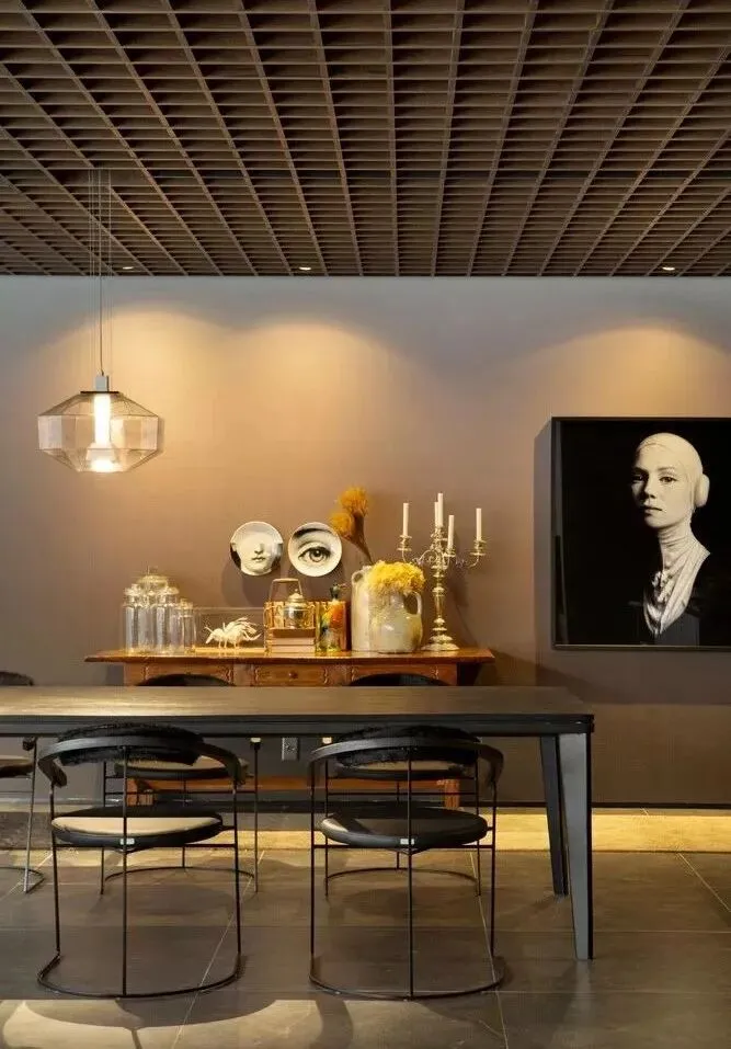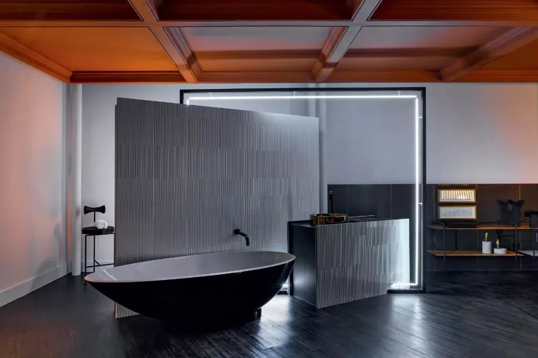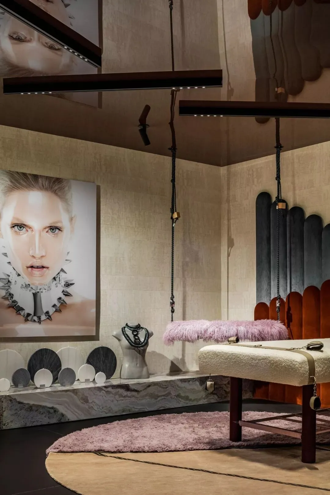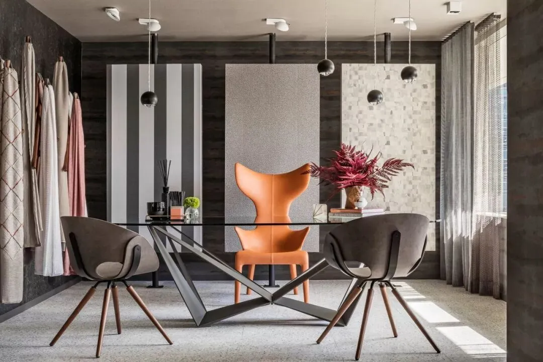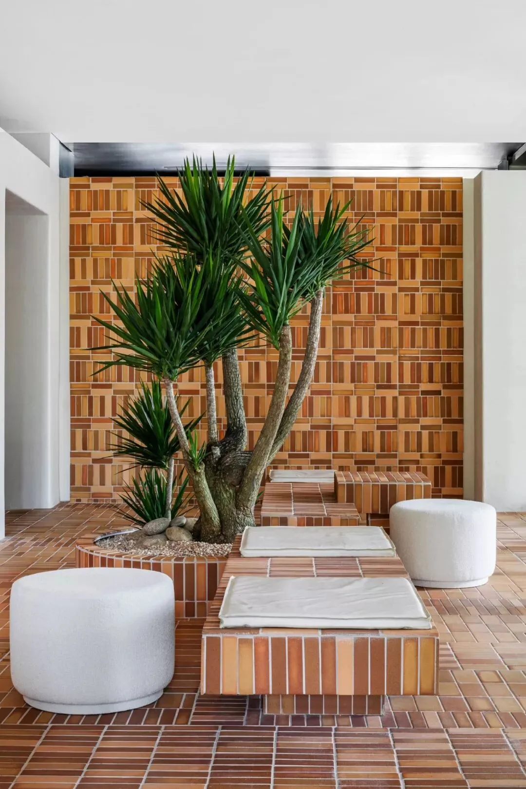 通过未来感的灯光设计,这个空间被想象成一个装有珍贵家具的珠宝盒,设计师首次展示了全套KOA桌子系列。urbina 创造了动态灵活的环境,特别是对于在家工作的人来说,这里简直舒服极了。这个景观设计作品 是建筑工作室 PININFARINA 联合景观事务所 LAND DESIGN 共同创作的。以沉浸式体验,使观看者可以融入内部空间中。米歇尔·海姆 Michelle Haim 是室内设计公司Fanny Haim & Associates的首席执行官兼创意总监。她以柔和的设计手法,将正方形和矩形、圆这类精妙的几何图形揉进空间里。由 Seneca 公司生产的赤土砖几乎覆盖了整个房间,沙色的材质看上去既古老又充满未来感。Moniomi是罗纳德·阿尔瓦雷斯(Ronald Alvarez)和莫妮卡·桑塔纳(Monica Santana)夫妇创立的室内设计工作室,以其精致迷人的商业和住宅项目而闻名。他们将挂毯,拱门,球体,有机玻璃桌等元素用做装饰家居,粉红色的墙面用蓝色图形加以强调。大理石做点缀增加了空间的奢华。他的设计兼顾艺术与时尚,让材质的天然触感在空间中蔓延。