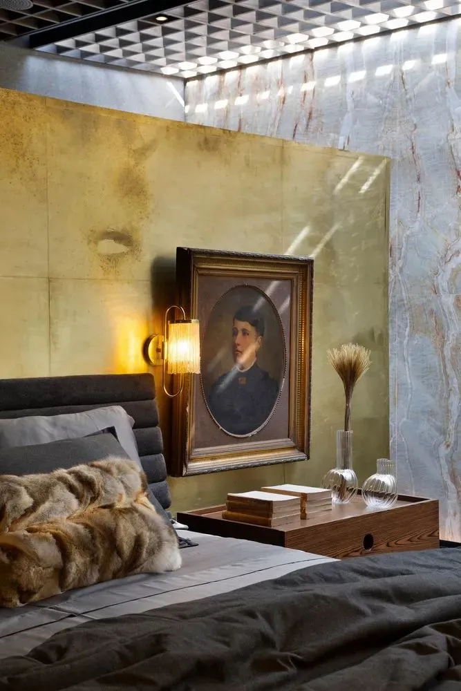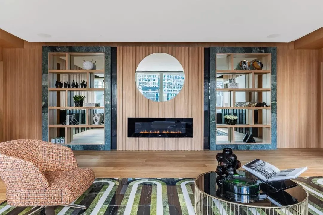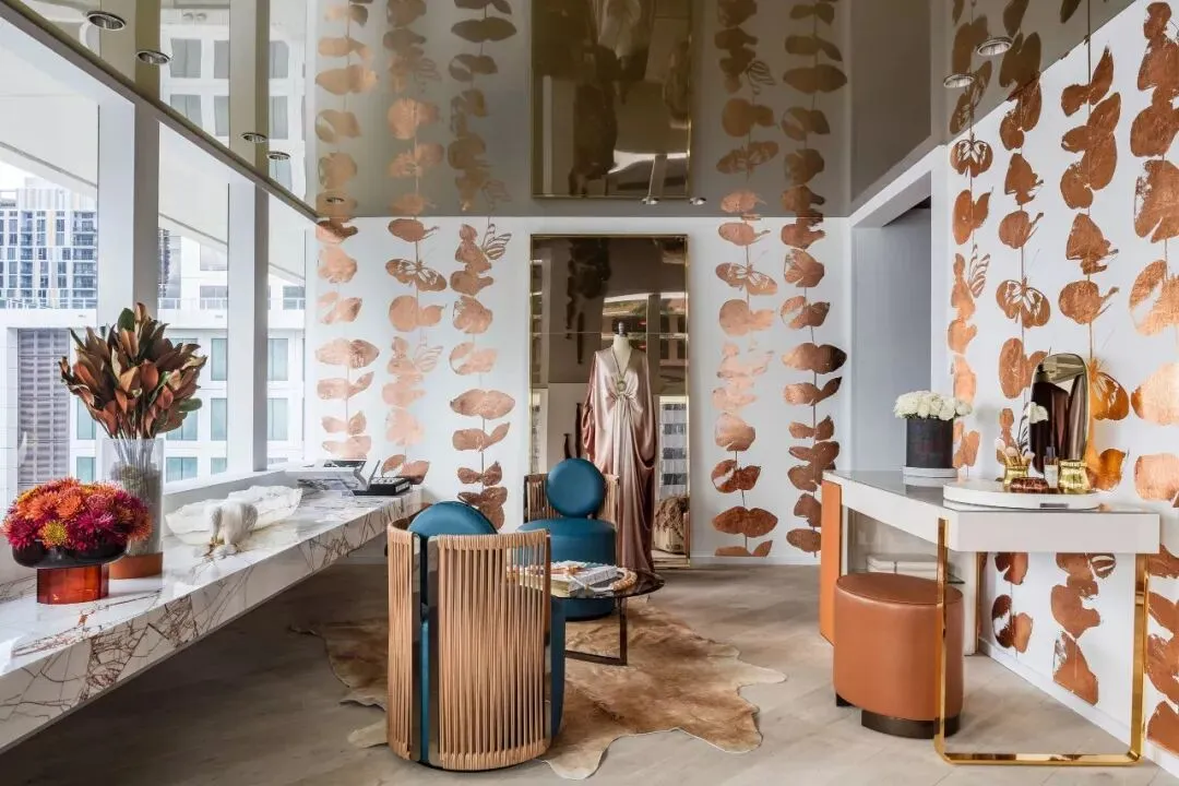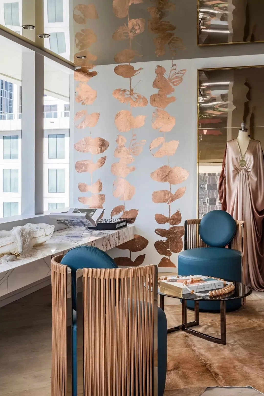 Christiana 是工作室 In Plus Inc. 的负责人,其内饰以现代风格为主,融入了对历史元素的独特解构。来自佛罗里达的设计师夫妇 Brett Sugerman 和 Gisele Laure于 2006 年创立他们的工作室。不仅接手商业地产项目,同时还在设计、生产家具和灯具。以蝴蝶和叶片为素材制成的墙纸铺满墙面,与卧室的木质背景墙形成过渡,营造统一的奢华质感。