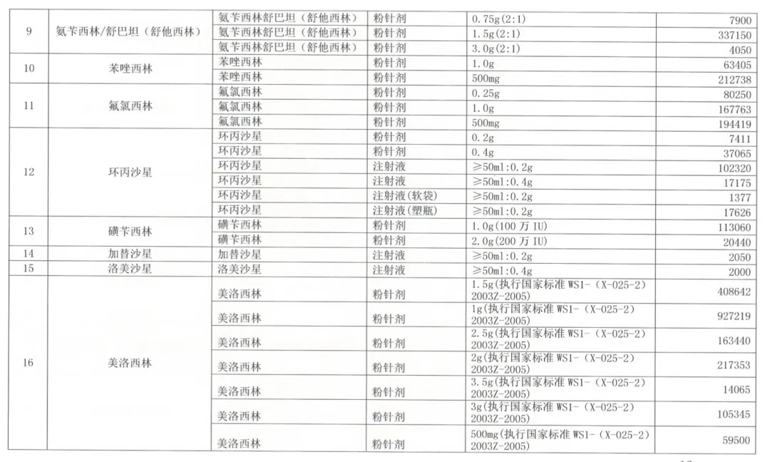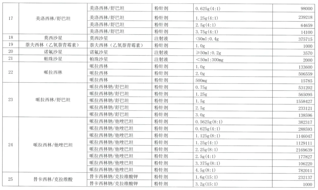 剩余的29个品种,抗生素占据绝大多数,且基本都是注射剂,最终的报量结果也普遍较高:比如阿莫西林/克拉维酸三个规格的总报量超过1000万支。