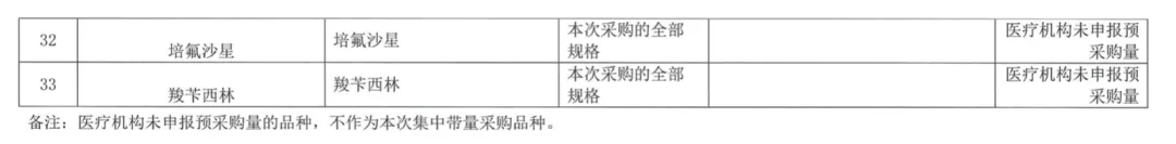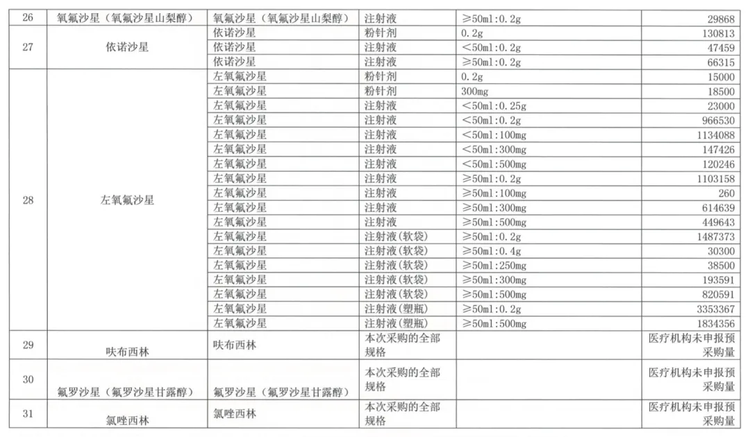 而本次更新的报量和品种名单显示,呋布西林、氟罗沙星(氟罗沙星甘露醇)、氯唑西林、培氟沙星、羧苄西林等4个品种由于医疗机构未申报预采购量的品种,被踢出带量采购的品种范围,带量品种变更为29个。