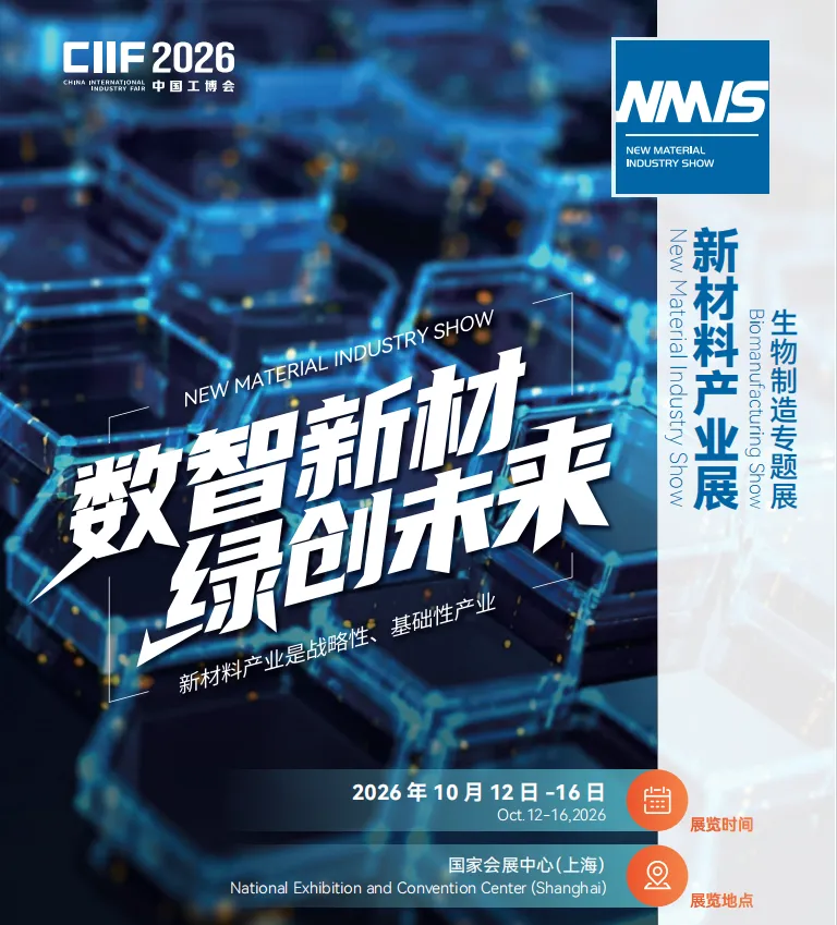 第二十六届工博会将在 2026 年 10 月 12-16 日在国家会展中心(上海)举办。新材料产业展作为中国工博会旗下专业展之一,立足于推动产业链上下游合作为目标,致力于推动新材料产业高端化、数字化、绿色化、融合化发展。为新材料及其应用企业搭建展示、洽谈、交易平台的同时,服务新材料产业的研发、应用和推广,推动新材料产业更高质量发展。
