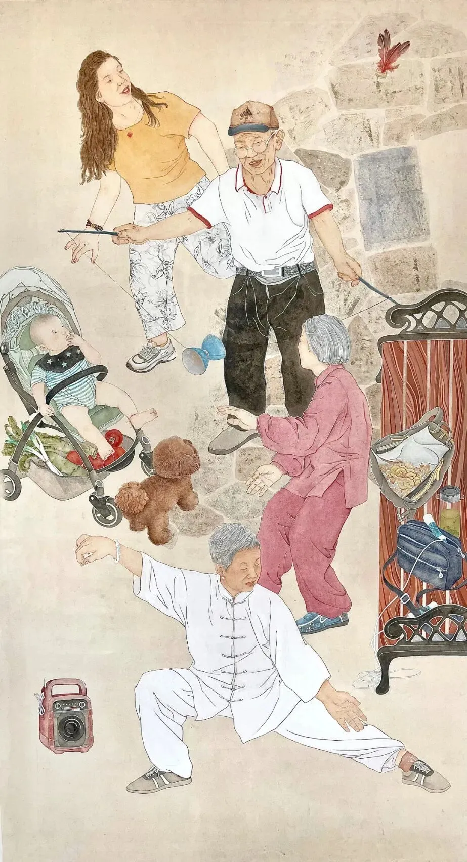 作品描绘城市公园里晨练一隅,创作总体以传统线描与渲染等为主要表现手段,构图采用散点透视与焦点透视相结合的形式,在以线造型的基础上对人物进行写实化描绘,人物形象彼此呼应,画面整体营造出一种轻松、宁和的氛围。