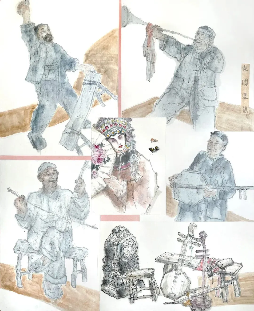 作品为方形拼接式构图,选取了分别演奏月琴、板胡、长号、敲击条凳的华阴老腔人物形象,以及戏曲人物形象,用淡墨勾勒人物的轮廓和特征,辅以皴擦塑造人物面部形象,展现出其神态和情感,使人物形象更加生动。最后以形渲染,使画面更加具有丰富的质感和柔和的美感,表达一种对朦胧浪漫的精神家园的向往。