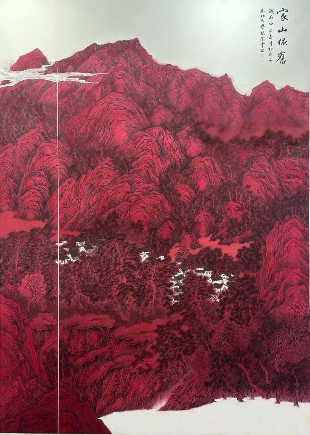 在创作中以陕西秦岭太白山秋景为描绘对象,通过以前拍摄的图片进行参考,围绕着山水展开,将自然实境与传统绘画布局相融合,通过松树、红衫、房子等元素,表现线条的动荡和色彩的冲击结合的山水面貌,准确地表达自己的情感和观念,创作出既有自然美又富有个人特色的山水画作品。