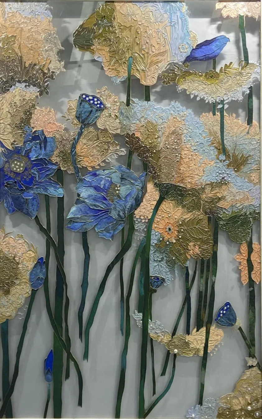 作品描绘了荷花的姣好姿态,画面构图饱满,放眼望去是足以淹没视线的荷叶,片片荷叶之下是盛放的荷花和含苞欲放的花蓓。近处矗立着长长的向上延展的茎,密布的荷叶向远处无限蔓延,引发观者的无穷遐想。作者运用低纯度的暖灰为主色调,将荷叶晕染的生机勃勃,画面中的两朵蓝荷,在这一望无际的暖色海洋里格外醒目,勾勒出“万灰丛中一点纯”的美妙景色。