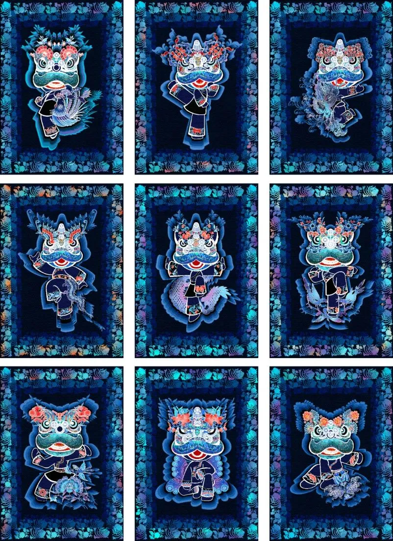 《湘苗狮韵》创作灵感源于湘西矮寨苗族百狮会的独特文化魅力,提炼了湘西矮寨苗族百狮会的造型特点、巧妙地融入苗族武术及舞蹈动作,运用了苗族独特的色彩体系,以蓝色为主色调,加入苗族传统动植物纹样的运用丰富视觉效果,创作出了一系列既具有装饰韵味又充满民族风情的画面。