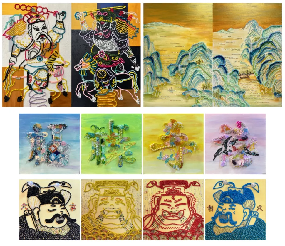 钉珠系列作品以中国传统文化元素为背景,包括年画经典、国画名作,进行艺术元素的提炼与再设计,使用钉珠工艺进行作品创作。运用到的技法包括钉珠、绘画,以多种钉珠技法为主要表现技法,配合绘画和其他综合材料表现手法。通过四组主题系列作品《幕山青》、《福禄寿禧》等实践印证了研究当代钉珠工艺价值,探索出具有中国民间特色的现代钉珠艺术作品。