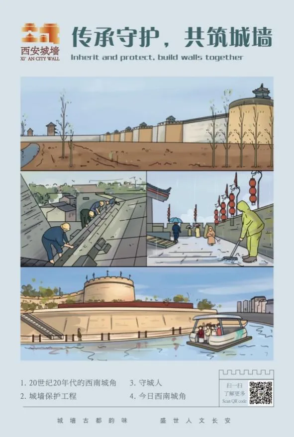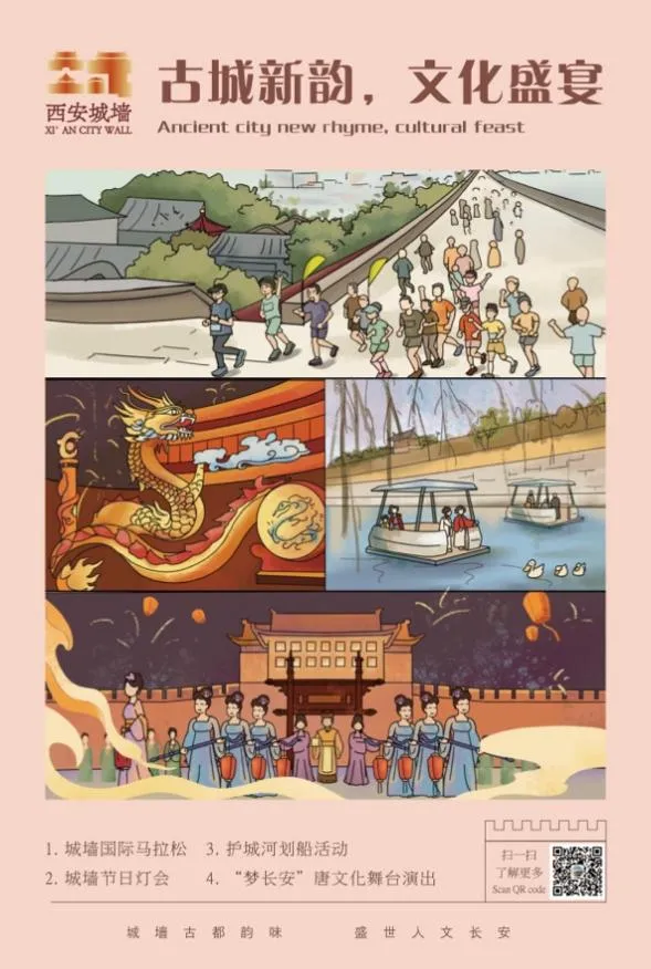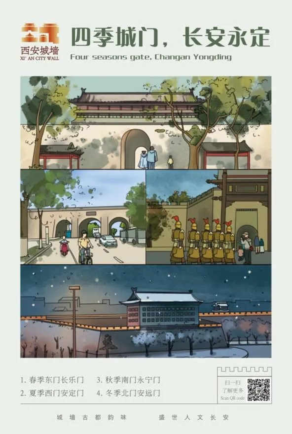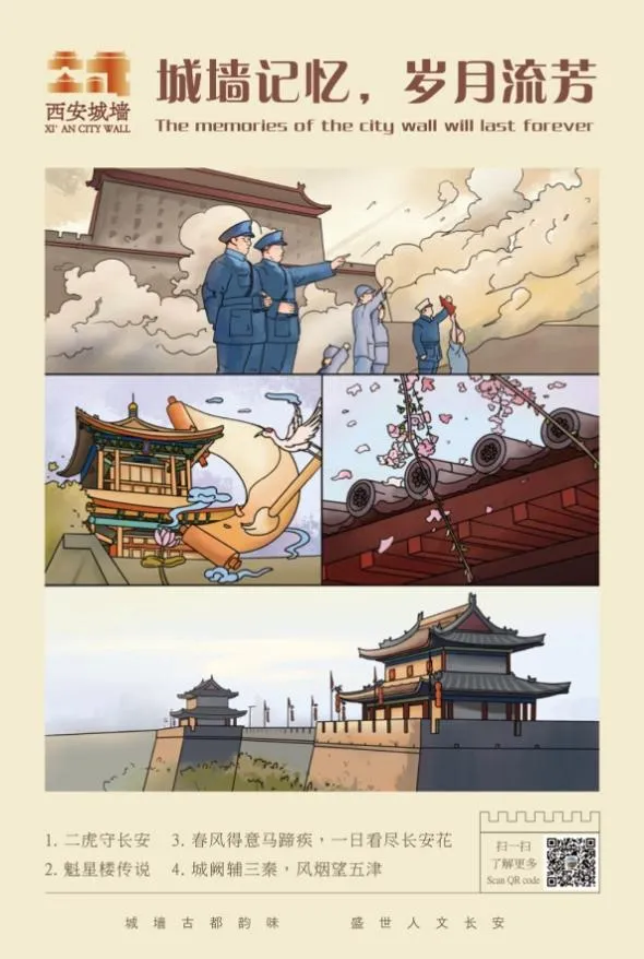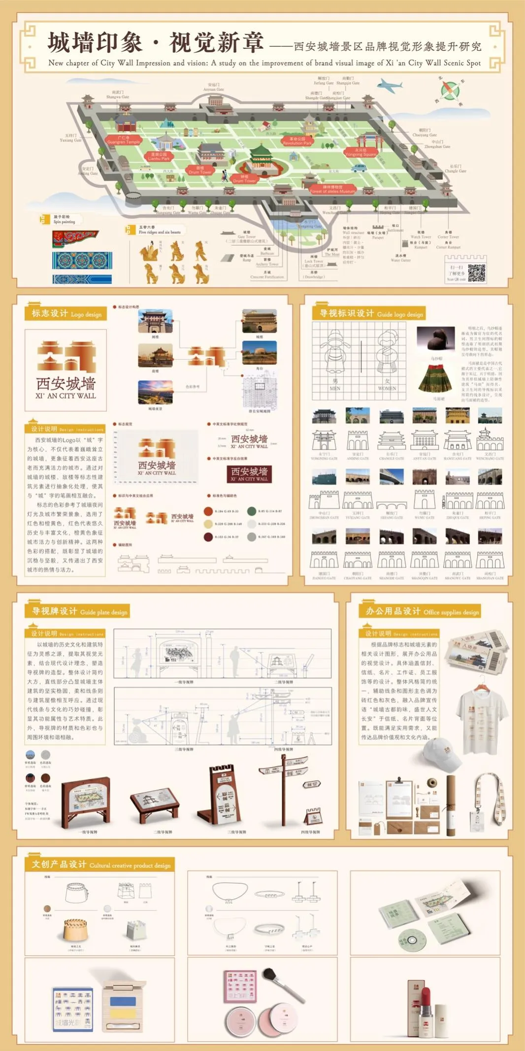 本次设计实践以西安城墙为主题,深入挖掘城墙的历史文化、建筑艺术和纹样等方面的视觉元素,并加以提炼和组合,以艺术化的表现形式进行呈现。具体内容涵盖了景区标志、导视系统、景区全景手绘地图、主题宣传海报以及文化创意产品的创新设计。通过这些设计,构建完整的西安城墙景区视觉识别系统,塑造一个具有城墙特色、充满活力且富有艺术性的景区形象,进而提升西安城墙景区的品牌视觉形象,吸引更多游客,增强景区的竞争力。