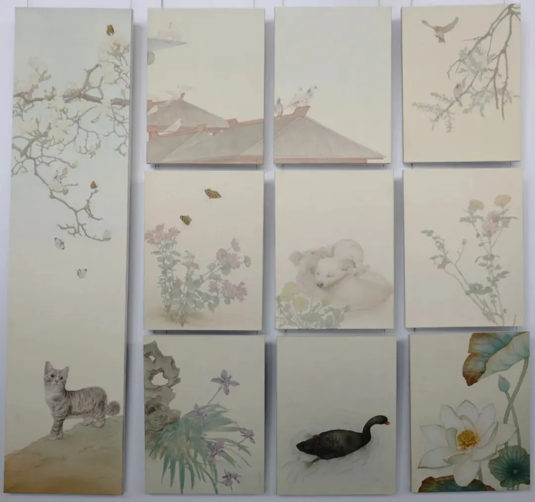 《且听风吟》以工笔花鸟的表现方式,描绘创作者在日常生活中所见所感,虽普通寻常,却恬静美好。作品以“且听风吟”命名,寓意珍惜当下,着眼当下生活的点滴美好,珍惜生活的每一个瞬间。既是创作者对自然生机、宁静生活的热爱,对田园生活、自然野趣的向往。也是对观者的提醒,希望大家勿因执着于远方,而错失眼前的美好。倘若留心,便能发觉生活处处皆美,目光所及处,一花一木亦皆为美景。