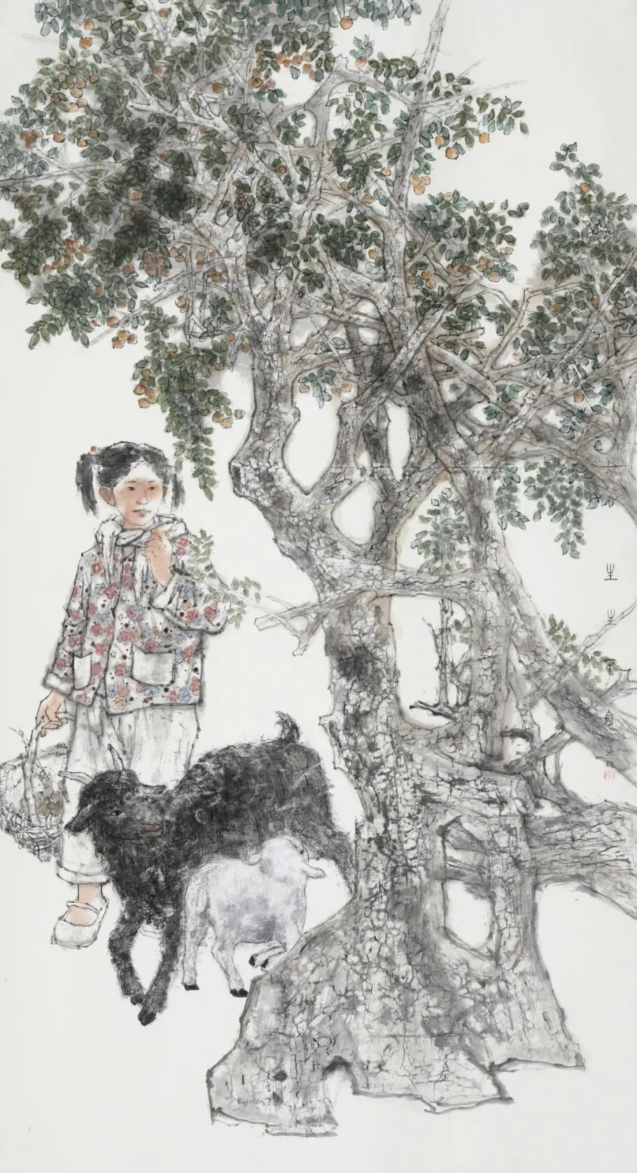 老沙枣树历经沧桑形成坚固的树干,树枝不断新生繁殖出茂密的枝叶,树下羔羊跪乳感母恩,正如《太极图说》中的:“二气交感,化生万物,万物生生而变化无穷焉。”沙枣树顽强耐寒,抗风沙的精神正是值得人们学习的地方。