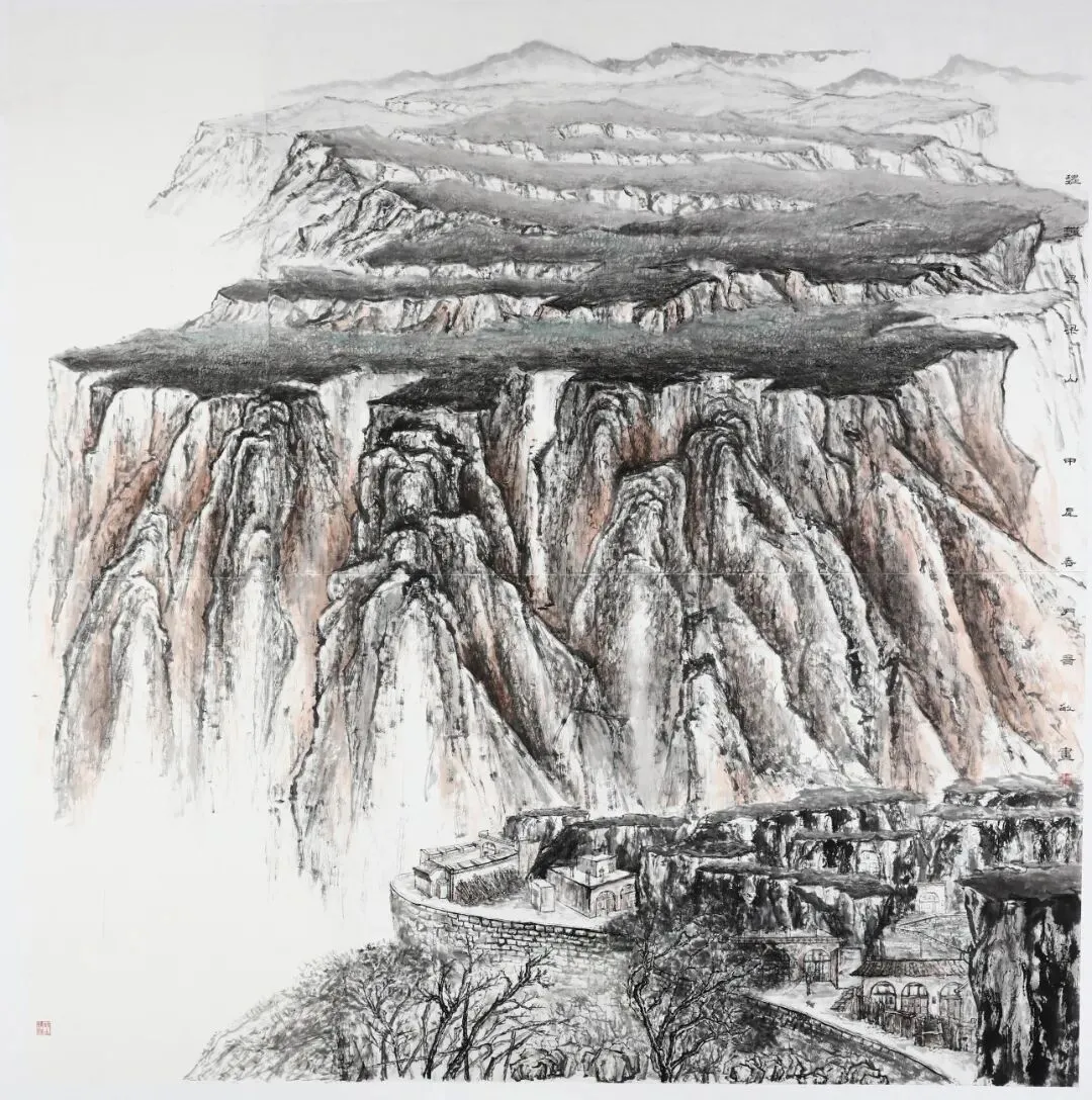 《巍巍吕梁山》创作选取山西西部吕梁山的黄土面貌为客观对象。整体采用平远偏俯视构图,画面前景由树木、土坡及小土块组成,中景为人民居住的窑洞。前景和中景在画面的占比较小,远景占据画面三分之二,大面积的山体将黄土塬的雄浑深厚尽收眼底。在水墨勾皴点染基础上,根据山体结构将凹陷处敷设以赭石为主色的淡彩。意在通过画面让观者感受黄土高原的烟火气息以及人民的淳朴善良,同时也更加激发了作者对故土的热爱与赞美。