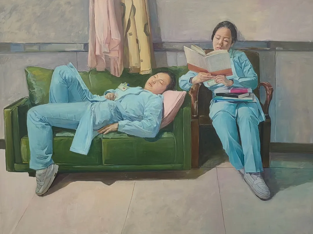 画面内容描绘了住院部护士站的一个晚上,疲惫的护士躺在沙发上浅眠和看书的情景,将同一个人不同时间做出的事件拼接于一个画面,根据所处社会环境和人文历史背景把人的灵性、抽象性的情绪和感情与油画进行联系,以纯视觉的方式呈现其生活状态,表现了自己的真情实感。