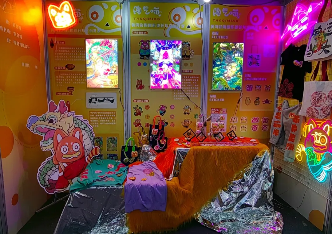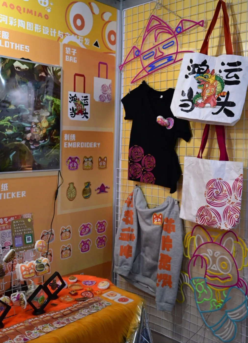 作品通过对黄河彩陶的深入研究,以潮玩服饰店为载体,设计出传统、潮玩、探索三个系列的衍生IP及相关图形设计。颜色采用流行色,打破传统彩陶单一的色彩,结合当代潮流,并将其运用到现代潮玩服饰等文创设计中。在各种不同的面料材质上进行图形设计,从而创造出各种大小的装饰材料,并通过DIY的方式让消费者能够亲自体验这些彩陶元素在服饰上的应用,更好的促进我国优秀传统文化的传承与发展。