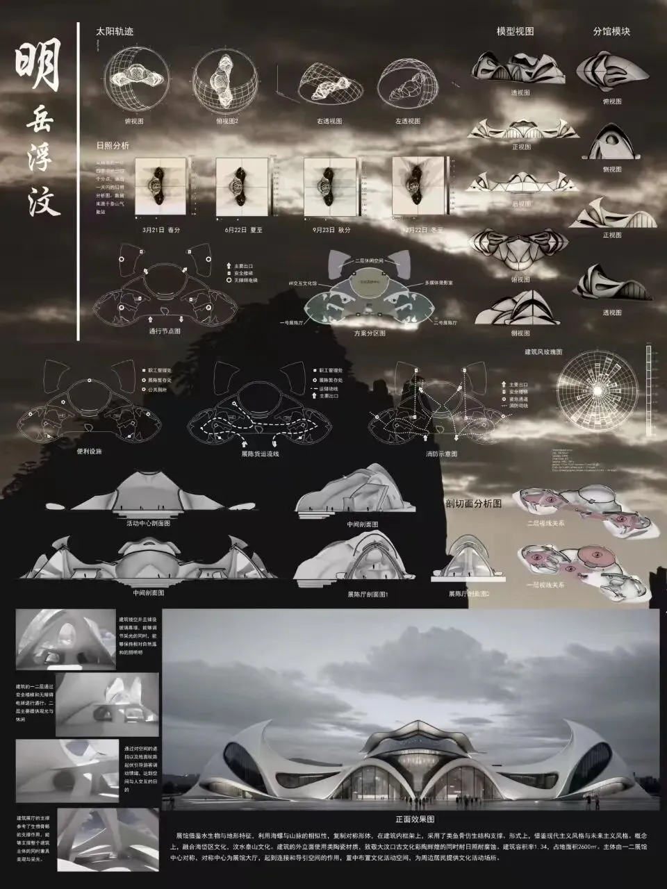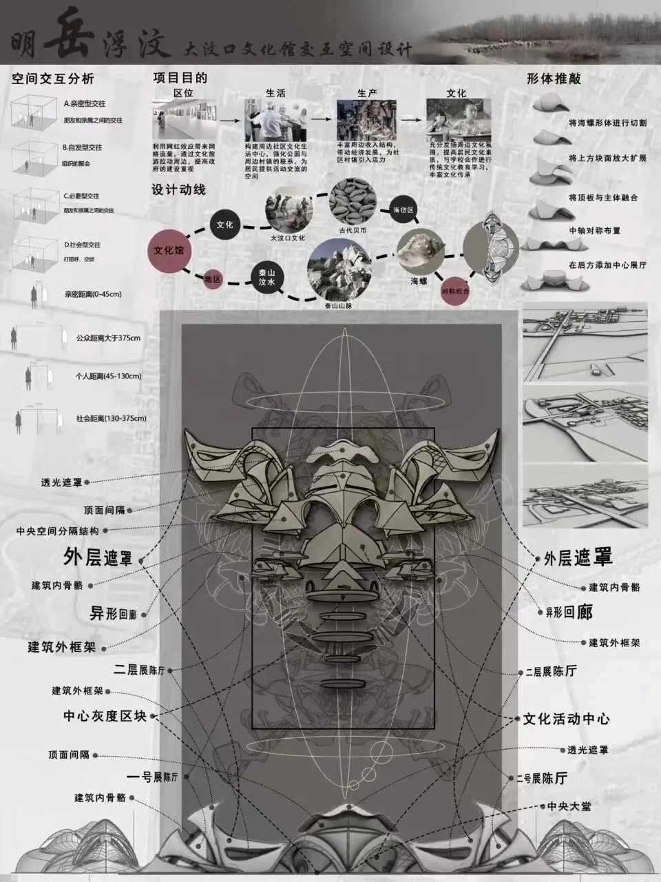 大汶口北临泰山,南临汶河。是大汶口古文化遗址所在地。周边拥有400年历史古村镇,改造并建设大汶口文化馆能够提高周边居民文化素养,改善生活条件,响应政府建设大汶口文化的号召,同时为周边居民提供文化中心与活动空间。展馆借鉴水生物与地形特征,利用海螺与山脉的相似性,复制对称形体,在建筑内框架上采用了类鱼骨仿生结构支撑。形式上,借鉴现代主义风格与未来主义风格。概念上,融合海岱区文化,汶水泰山文化。建筑的材质使用类陶瓷材质,致敬大问口古文化的彩陶辉煌的同时耐日照耐腐蚀。