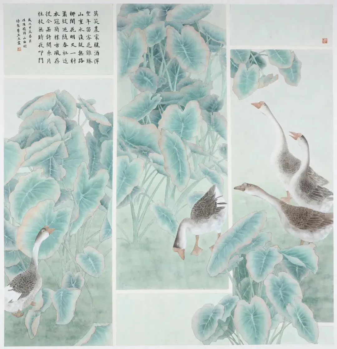 《憩栖》作品通过精细描绘“鹅”与“芋头叶”这两个富有田园特色的创作元素,展现了一幅生态宜居、风光旖旎的田园画卷。鹅在田地里觅食,芋头叶在微风中摇曳,这些细节都传达出自然与生活的和谐共融,以及对绿色生态环境的珍视。在新时代背景下,绿色环保理念深入人心,人们对美好生活的追求更加注重与自然环境的和谐共生。