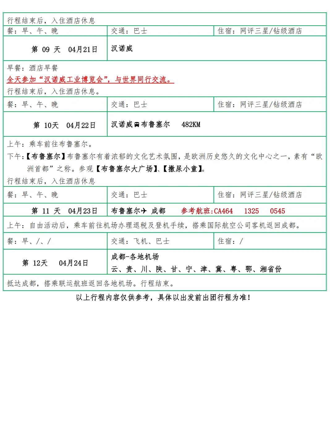 费用包含:欧洲团队签证、成都机场起止国际机票经济舱,指定城市联运、境外当地三钻酒店住宿双人标准间、行程列明的餐、境外空调用车、全程领队、展会门票、旅行意外保险。