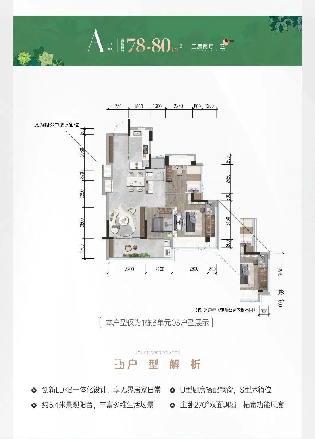 78-80㎡的3房2厅1卫,设计的是竖厅格局,客厅3.2米开间,LDKB一体化,S墙设计预留冰箱卡槽位,动静分区,主卧270无边转角飘窗,分别做到了主卧16.62㎡/次卧9.27㎡/次卧5.72㎡(包含墙体飘窗),客厅连接次卧出9.18㎡的大阳台,U型厨房,卫生间三段式分离,得房率约78.9%(不含赠送),西北朝向。套内面积62.15㎡+赠送面积15.35㎡=实得77.5㎡,加上赠送后得房率约98.41%。